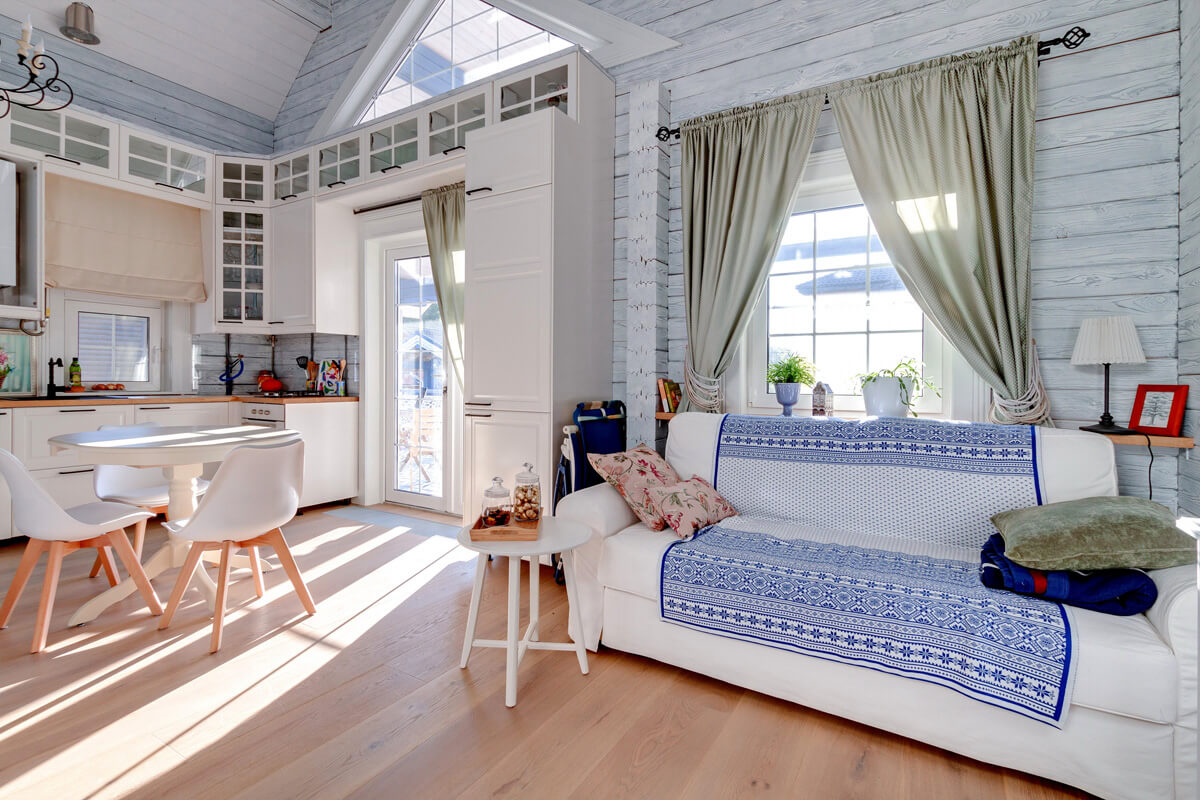 О внутренних, не побоюсь этого слова ввиду их размеров, пространствах. Так как гостиная небольшая — 26 кв. м, к тому же с кухонной зоной, простор ей добавили вторым светом, который объединил под своей крышей гостиную и антресоль. Антресоль оказалась прекрасным местом для рабочего кабинета с библиотекой. Больше всех антресоль полюбил кот.