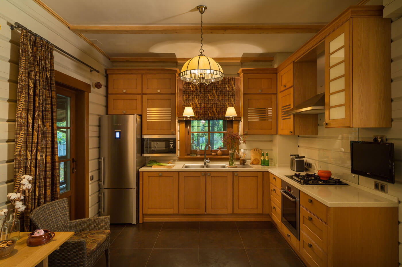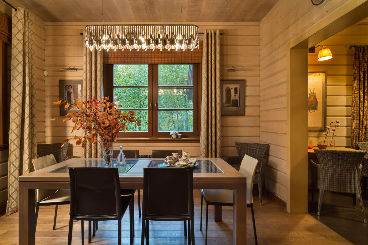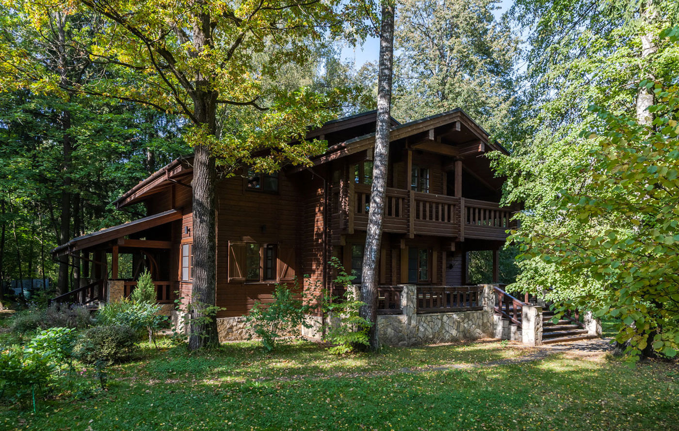 С естественным ландшафтом гармонирует здание в духе швейцарского деревенского дома с фасадами, тонированными под темный орех, и отделанным сланцем цоколем. Выбранному архитектурному стилю соответствуют деревянные окна со ставнями, балконы, широкие свесы и большие выносы крыши, позволяющие обитателям дома защититься от дождя и снега и проводить время на воздухе с ранней весны до поздней осени.