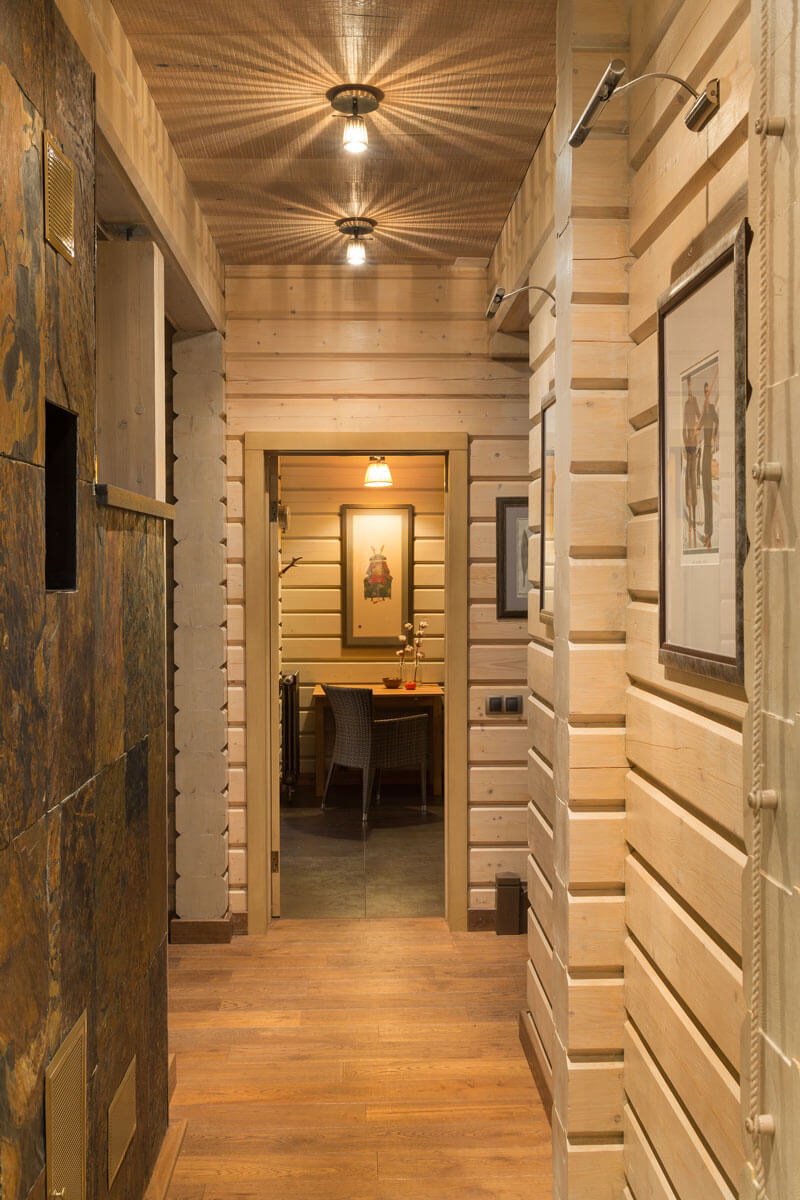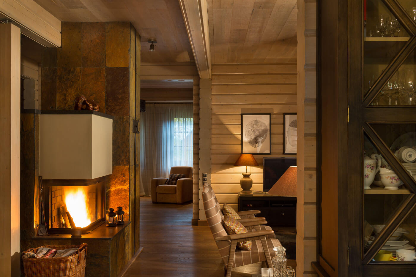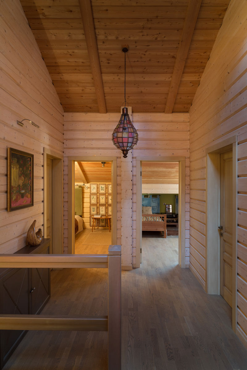 Дерево в качестве основного строительного и отделочного материала определяет стилистику оформления всех помещений и связывает их с пейзажем за окном. В поддержку дереву выбраны камень, натуральные ткани, кожа, мех и металл, в разных пропорциях включенные в интерьер. Пространственная композиция в доме выстроена вокруг открытого камина и лестницы, соединяющей разные уровни жилища.