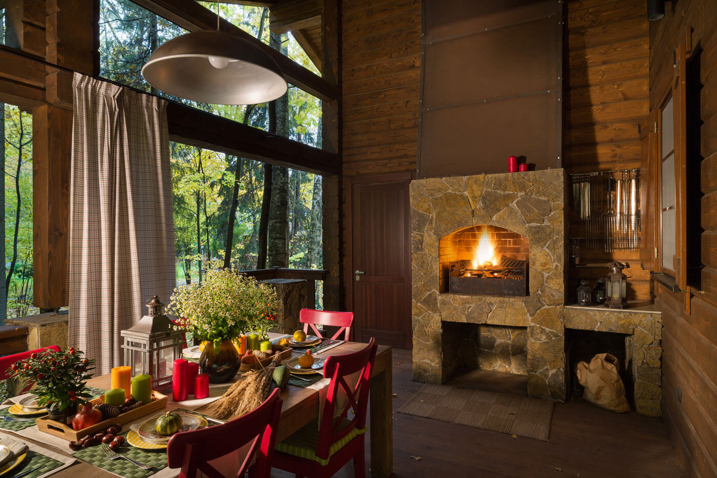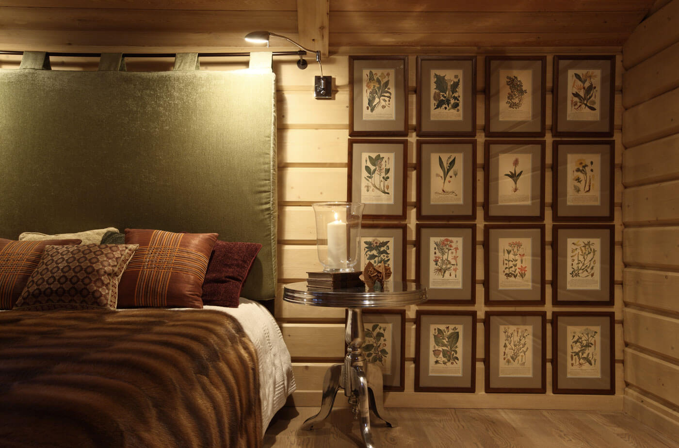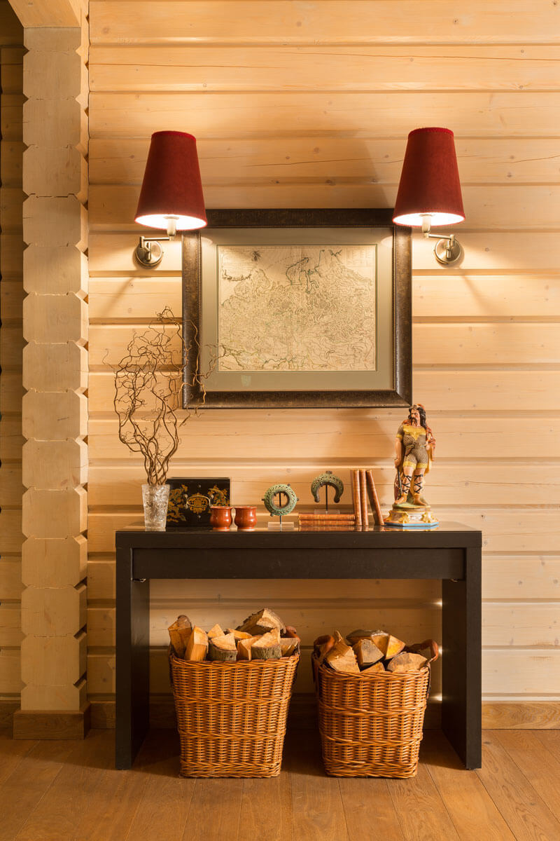 Дерево в качестве основного строительного и отделочного материала определяет стилистику оформления всех помещений и связывает их с пейзажем за окном. В поддержку дереву выбраны камень, натуральные ткани, кожа, мех и металл, в разных пропорциях включенные в интерьер. Пространственная композиция в доме выстроена вокруг открытого камина и лестницы, соединяющей разные уровни жилища.
