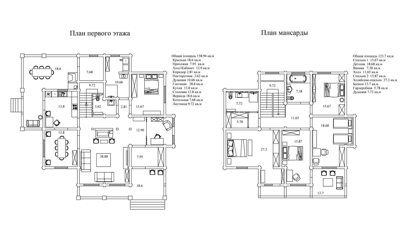 В соответствии с пожеланиями хозяев в доме появились большая гостиная, кухня и столовая, спальни для каждого члена семьи, вместительная гардеробная, прачечная, 3 санузла и большая крытая веранда с печью-барбекю, откуда можно попасть в кухню. Помещения, в зависимости от их назначения, сориентированы на разные стороны света: окна столовой выходят на юг, спальни - на северо-запад, чтобы утреннее солнце не мешало сну, веранда обращена на юго-запад, так что вечерние чаепития проходят в лучах заходящего солнца.