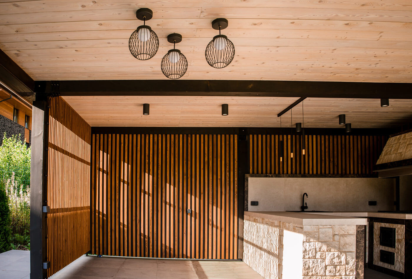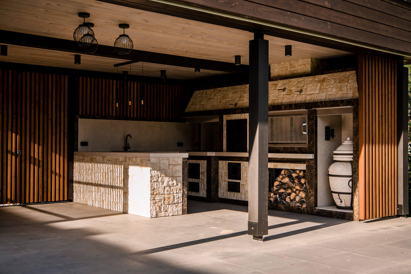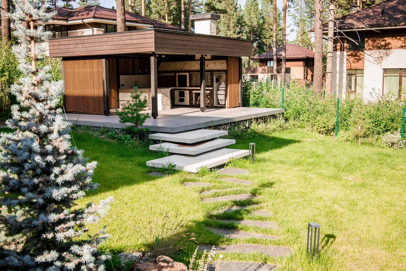 Покрытие дорожек в проекте разнообразно, это и строгие герметичные линии из прямоугольной тротуарной плитки, создающие ритм на верхней террасе, и извилистая дорожка из дикого камня, приводящая к беседке плавными комфортными линиями. Особое внимание стоит уделить открытой беседке для приема гостей и семейных встреч, она будто парит нам рельефом. Беседка выполнена в современном стиле, оборудована всем необходимым для приготовления разных блюд.