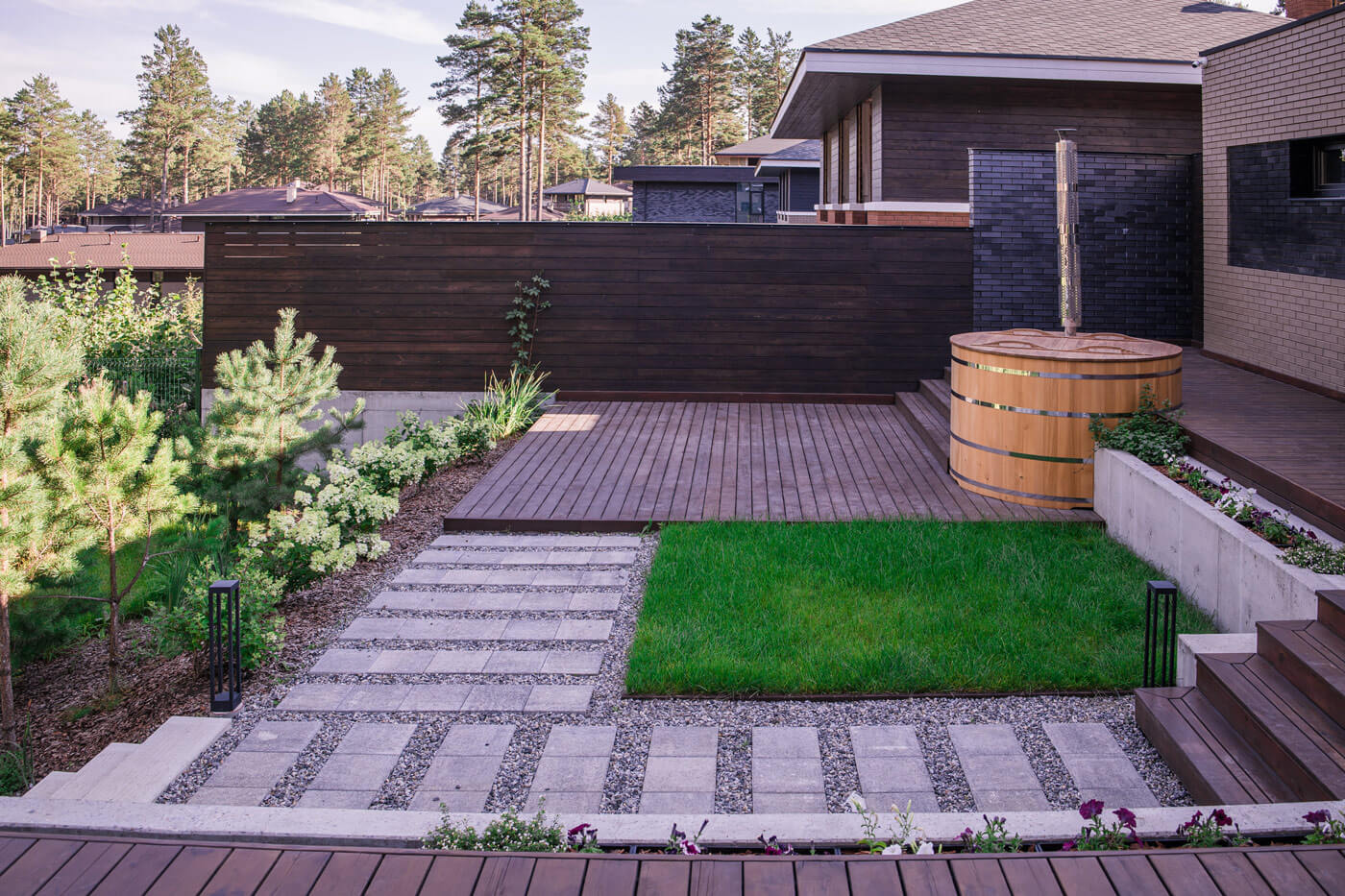 Опоясывающая терраса из термодоски связывает все строения на участке. Цвет террасы намеренно не совпадает с цветом планкена на заборе, чтобы горизонтальные и вертикальные поверхности не сливались. На террасе нет перил, визуальным ограждением служит озеленение из ярких акцентных однолетников в бетонных отшлифованных стенах. Установлена уникальная по технологии калитка, открывающаяся в обе стороны. При входе на участок привлекают внимание «парящие» ступени, с их помощью легко преодолевается сложный рельеф. Сами ступени оформлены модными в современном ландшафте злаками – овсяница сизая.