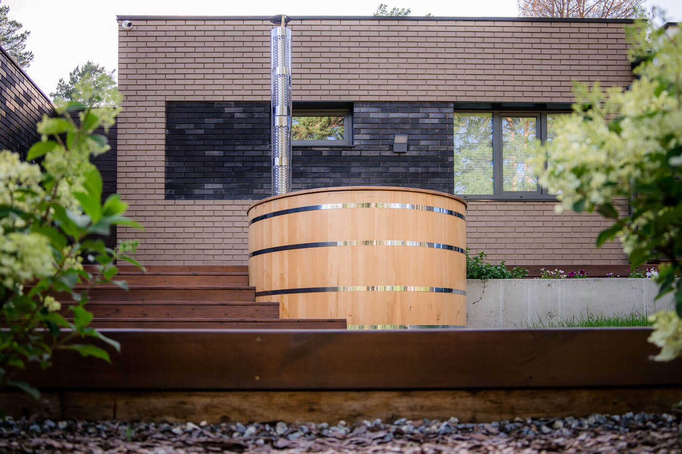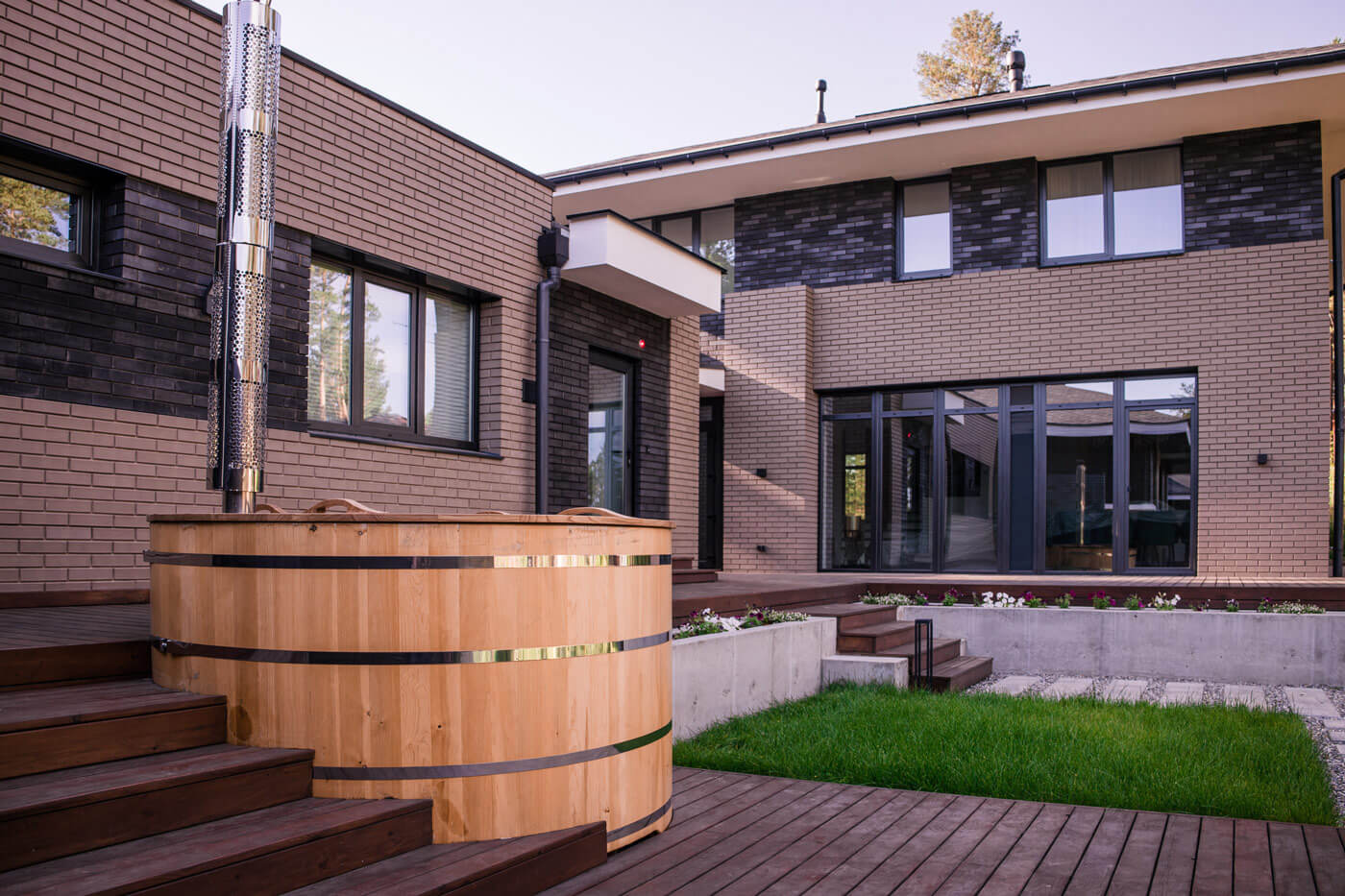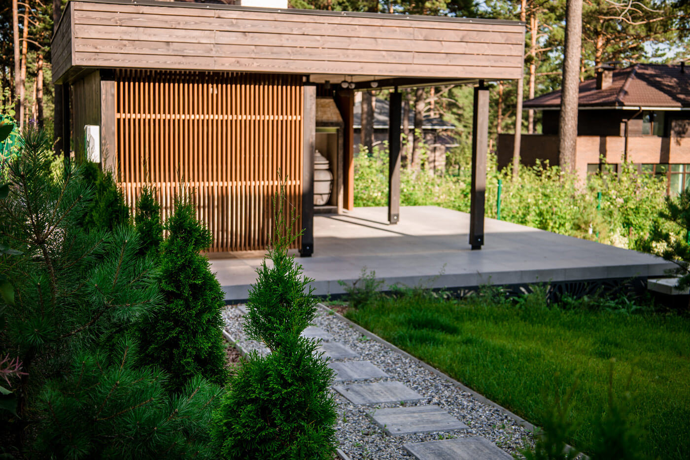 Участок функционально разделен на зоны активной деятельности – жилой дом, баню, гараж, отдельную террасу с лежаками и лужайкой, купель и отдельно стоящую беседку.