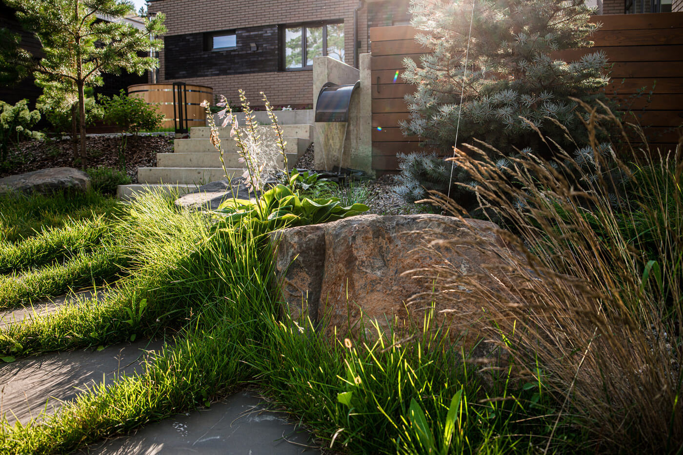 Для оформления участка были привезены огромные валуны, для создания горного ландшафта высажены горные ели и можжевельники. По желанию заказчика, в центре участка располагается роскошная красавица ель, которую видно с любой точки участка.