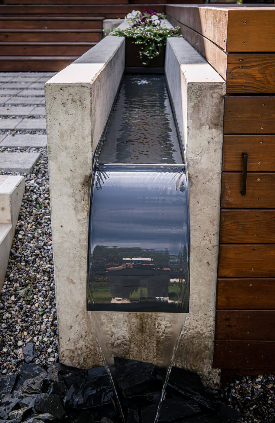Особый декоративный элемент в проекте – водный канал, переходящий в водопад. Движение воды символизирует активность жизни, а звук потока мотивирует на действия – жить полноценно!