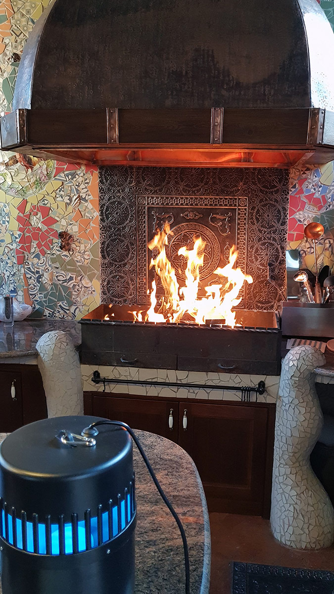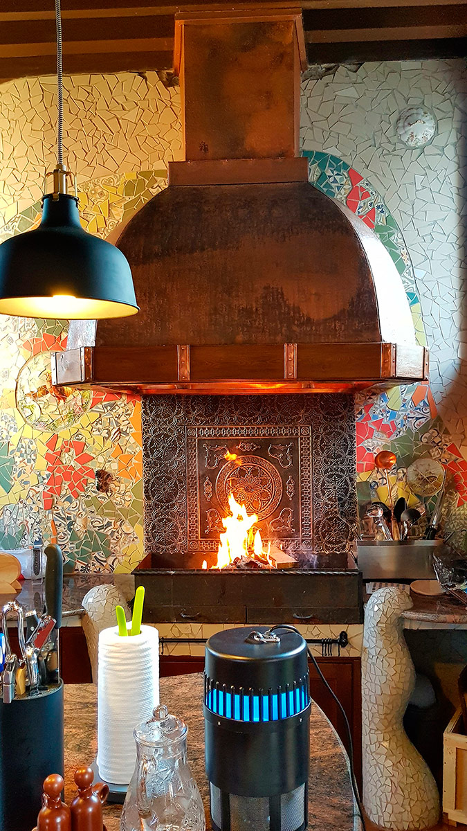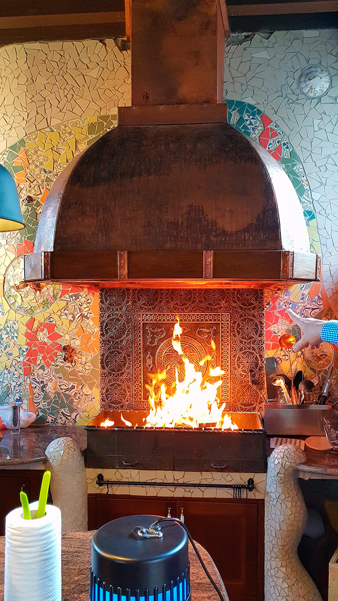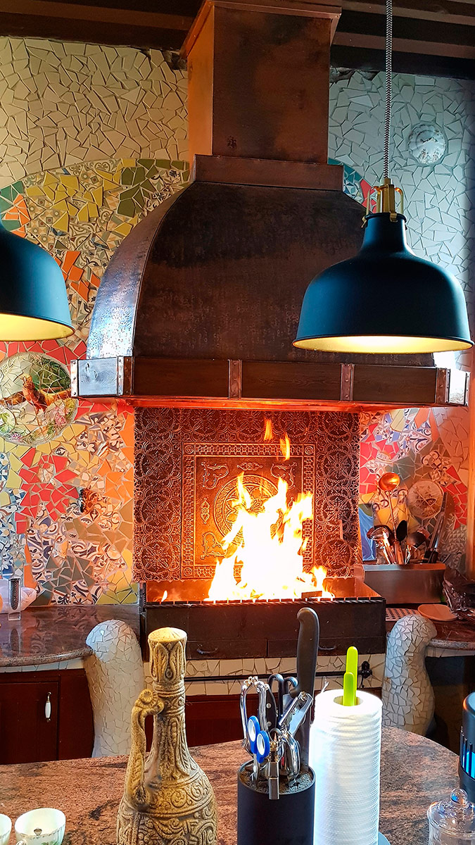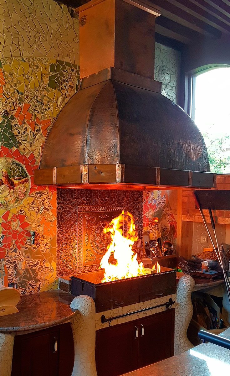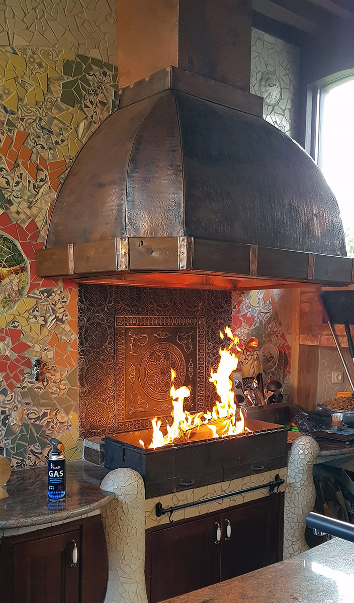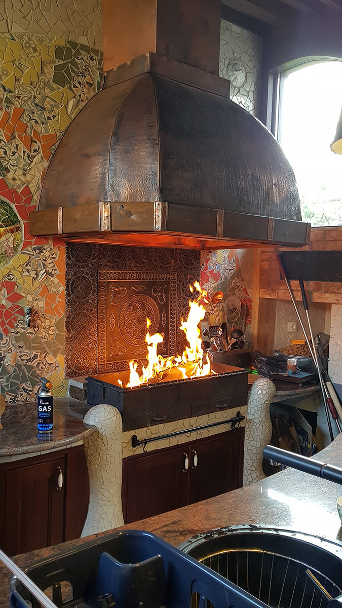Зона гриля предусмотрена для частного деревянного дома с элементами этнических мотивов, предназначенного для сезонного проживания. Столовая представлена в эклектичном дизайне. Стены оформлены в виде мозаичной выкладки. Сочетание таких материалов, как камень, мрамор, стекло, дерево, медь и чугун, позволило создать зону гриля в свободном импровизированном стиле. Комбинированный дизайн-проект гриля выполнен из меди и камня, с мозаичной облицовкой декоративной панели. Кроме того, для придания аутентичности «гордости кухни» было изготовлено медное панно с элементами узоров и растительной тематики, соответствующей витражной композиции стен.