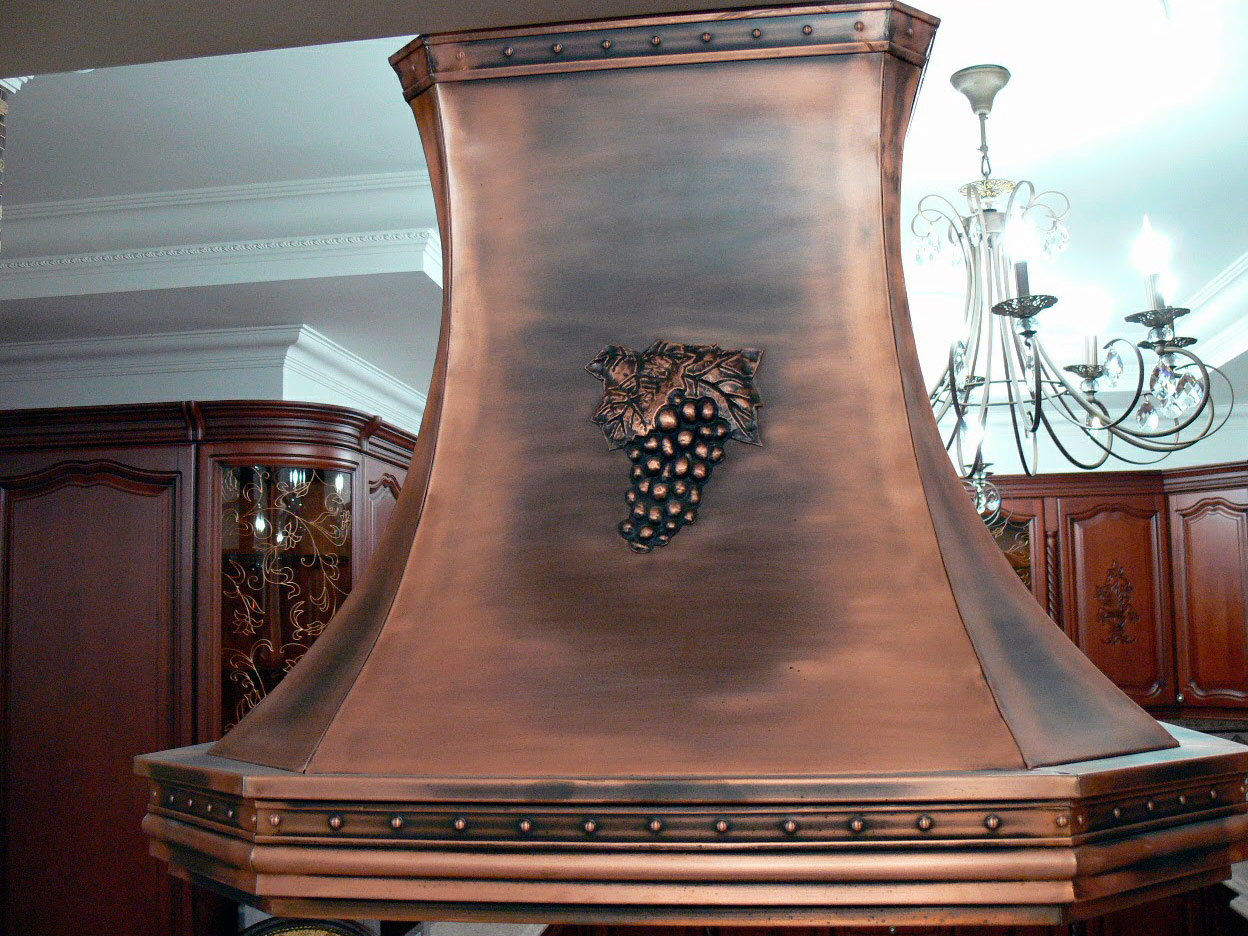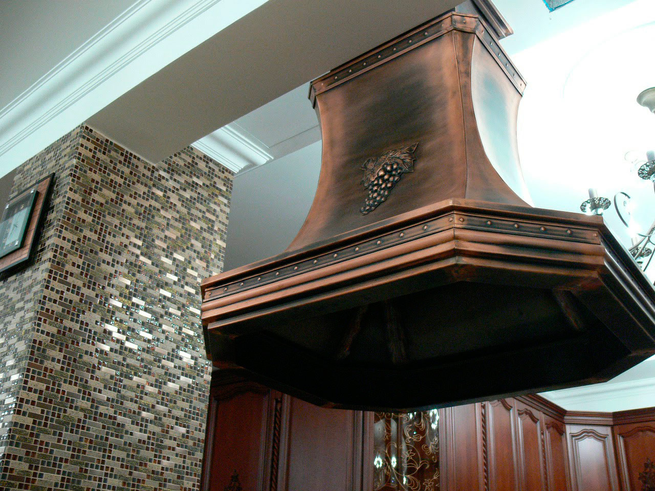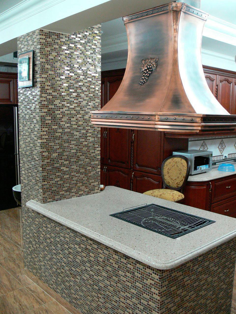 Зона гриля получилась лаконичной и вписалась в общий стиль столовой. Подобный эффект ультрасовременной старины создан за счет выколотки (дифовки) меди — приема холодной обработки листового металла.