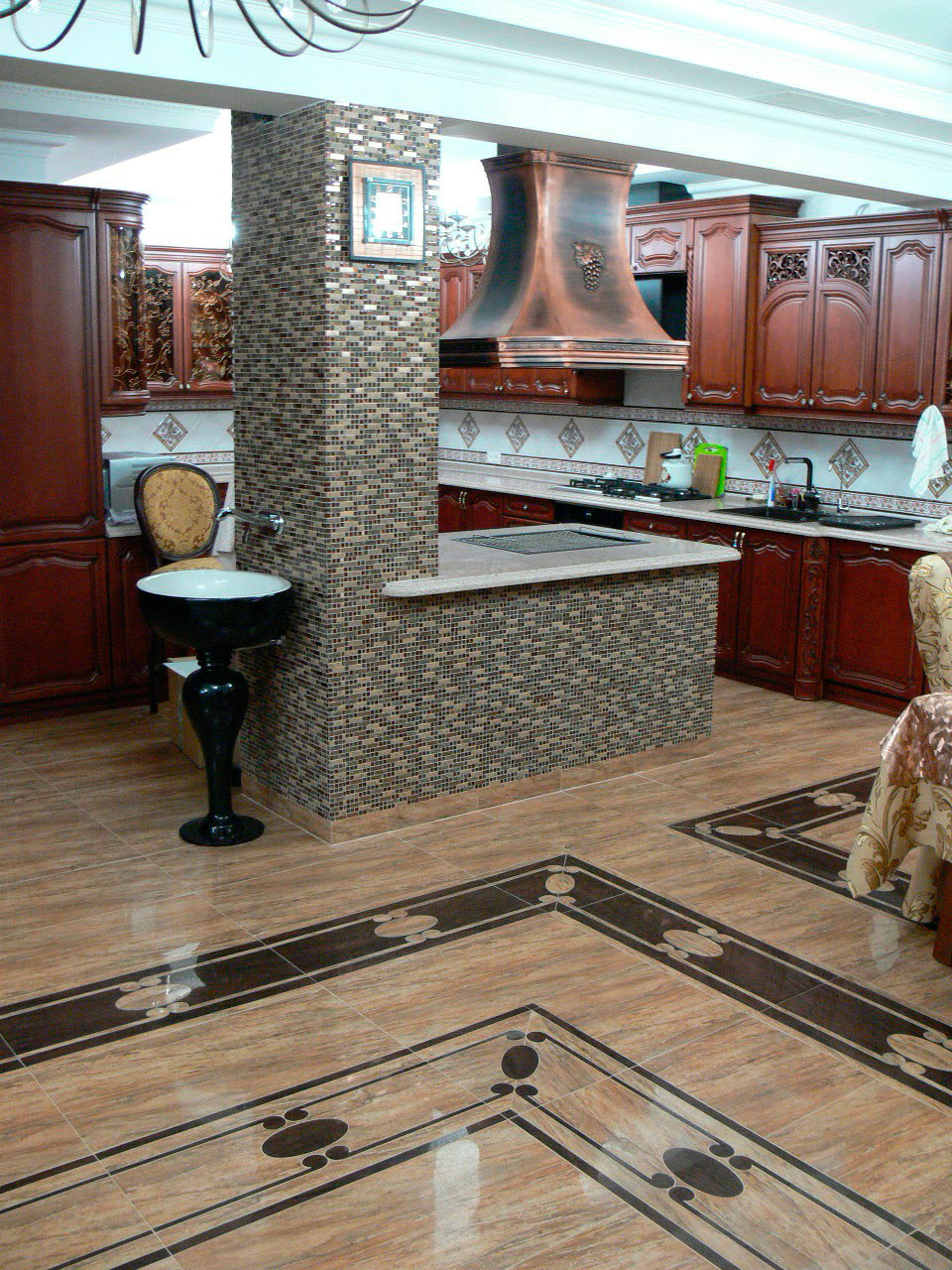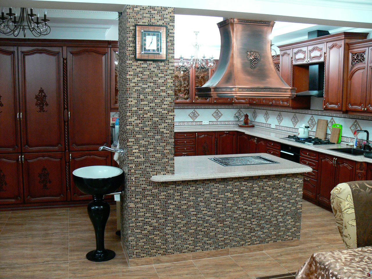 Поскольку интерьер кухни обязывал соблюдать строгость и консерватизм в решениях, было задумано сделать классический медный колпак — вытяжной шкаф и эргономичную зону гриля, которая не занимала бы много места: на первый взгляд создается впечатление, что это традиционная варочная поверхность.