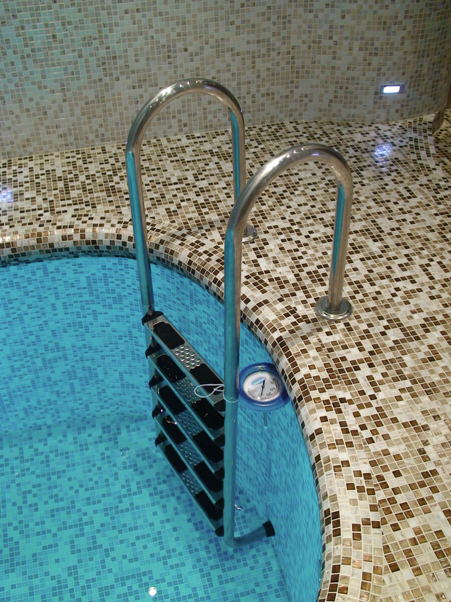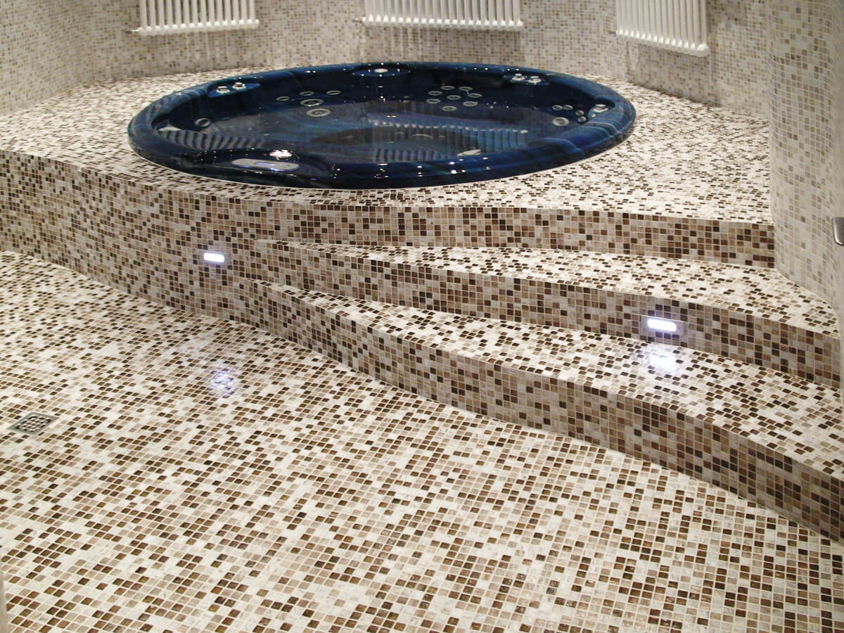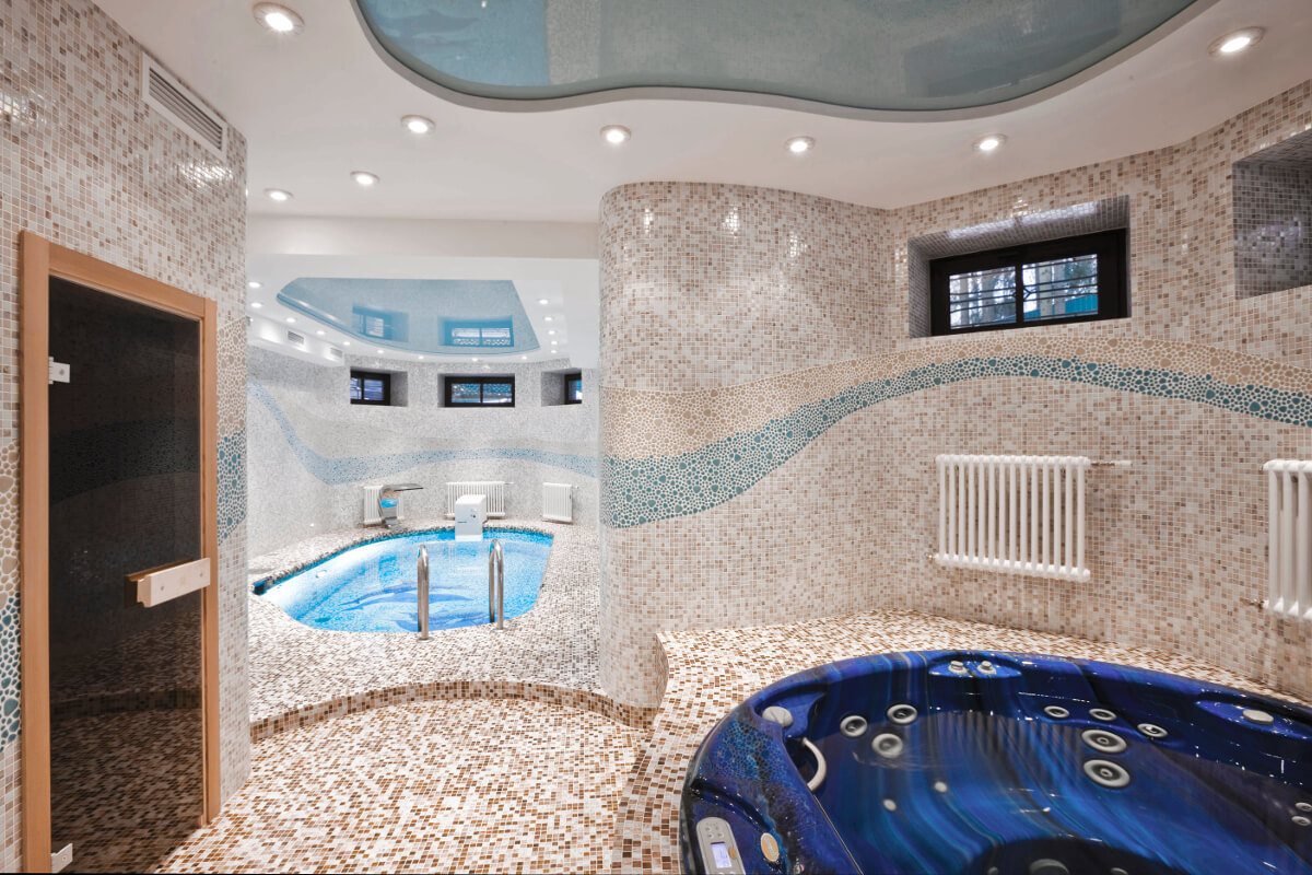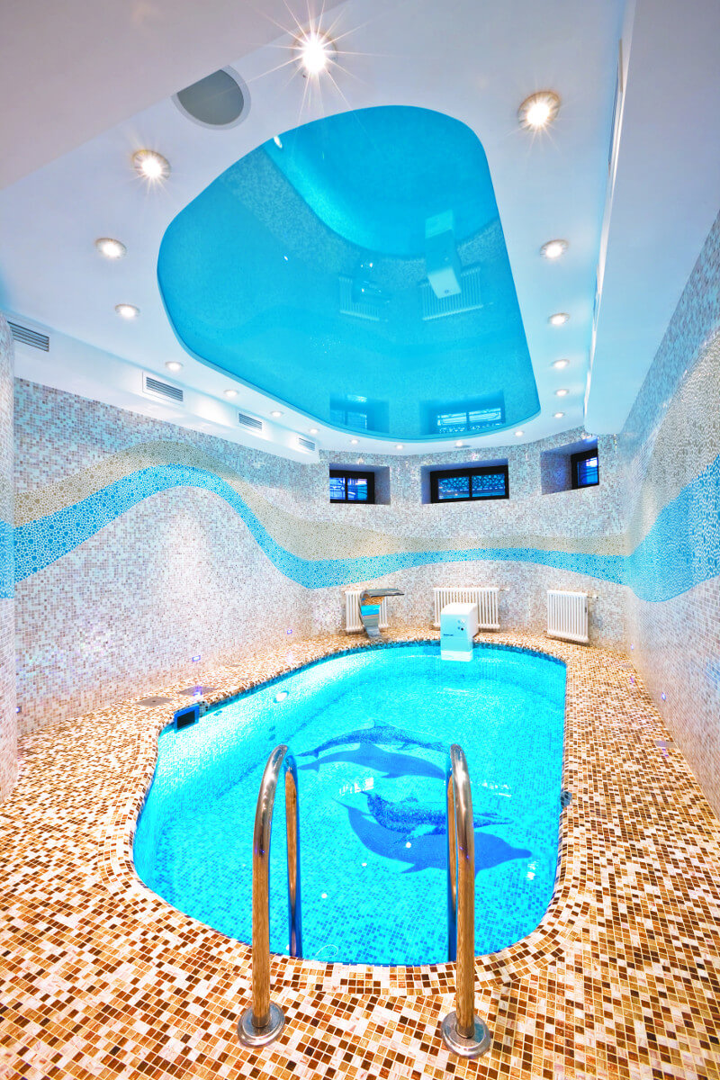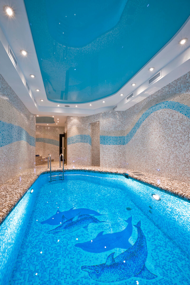 Бассейн, как и вся wellness-зона, расположен в цокольном этаже четырехуровневого коттеджа. Сочетание двух типов мозаики «морские камешки» создают волны на стенах. А панно с почти живыми дельфинами выглядит потрясающе.