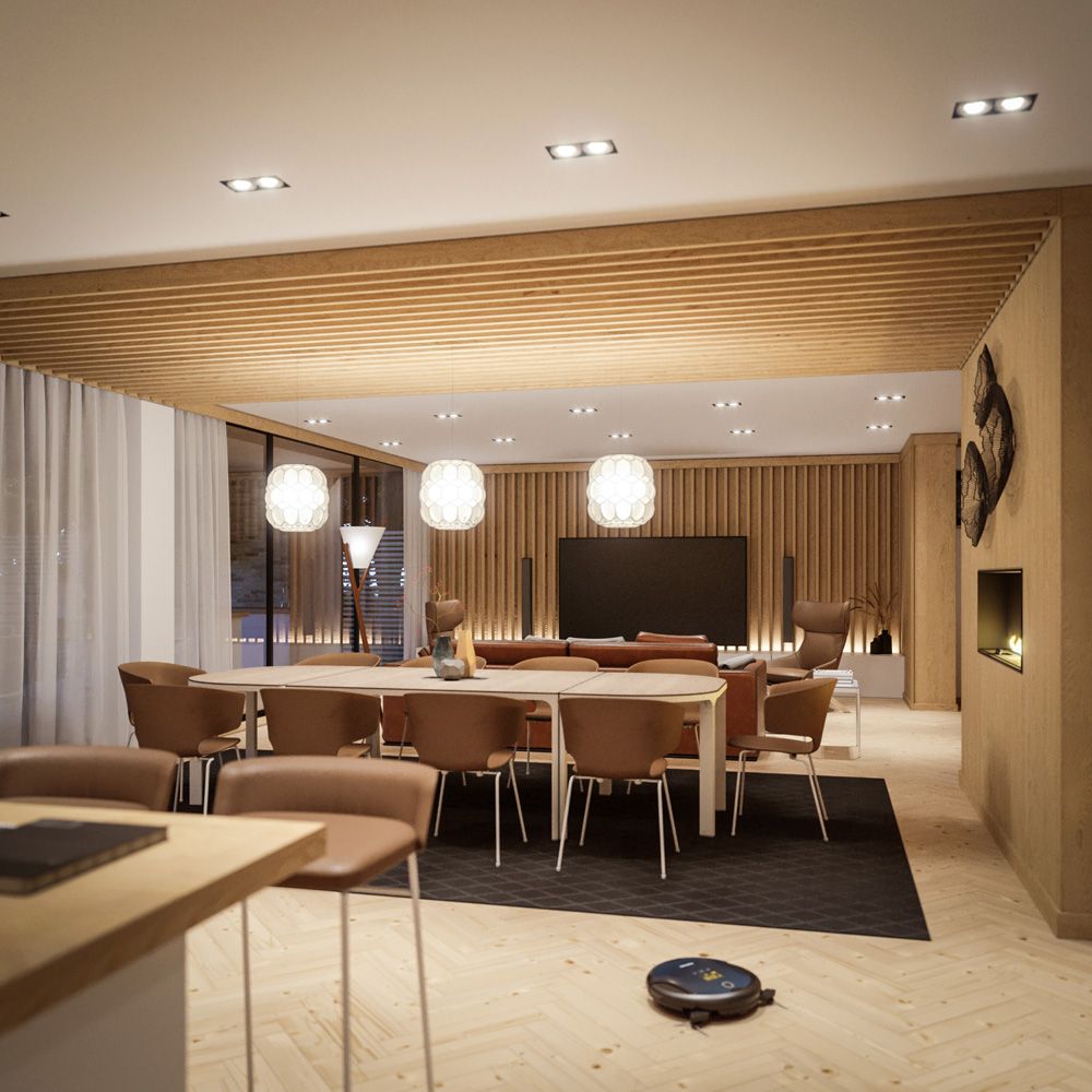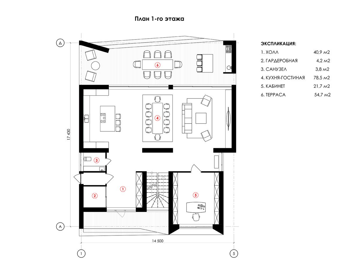 Дом состоит из двух объемов, жилой части и гаража. На первом этаже дома располагаются просторная кухня-гостиная со встроенным камином и выходом на летнюю террасу, оборудованную газовой плитой, гардеробная и кабинет с большим панорамным окном.