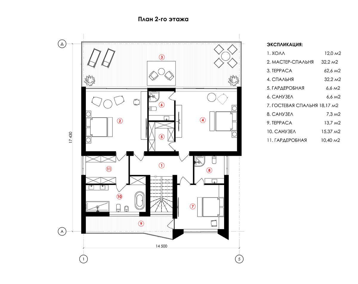 На втором этаже находятся хозяйская спальня, детская спальня и гостевая. Все спальни оборудованы отдельными санузлами и гардеробными, чтобы максимально избавиться от шкафов в помещениях.