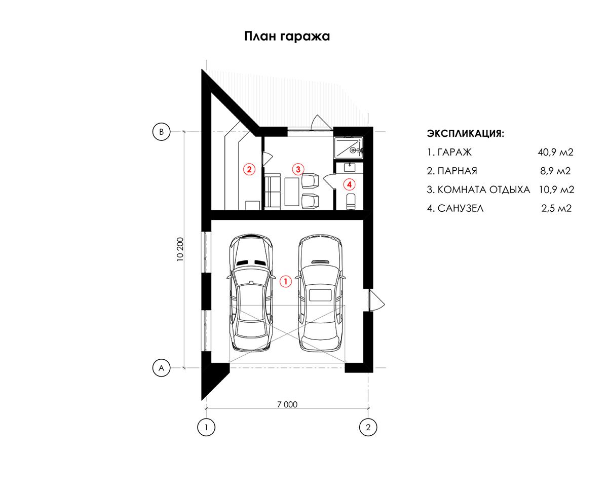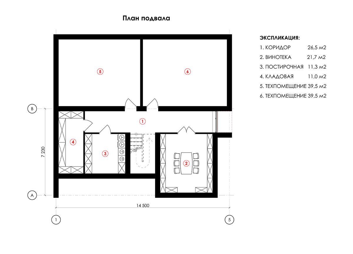 Еще одно требование — организация винотеки, так как глава семьи — большой любитель хороших вин и занимается их коллекционированием. Винотека находится в подвальном этаже, куда также были вынесены постирочная и кладовая с морозильной камерой. В отдельно стоящем здании располагаются гараж на два автомобиля, камера сухого жара с комнатой отдыха и санузлом с непосредственным выходом к бассейну.