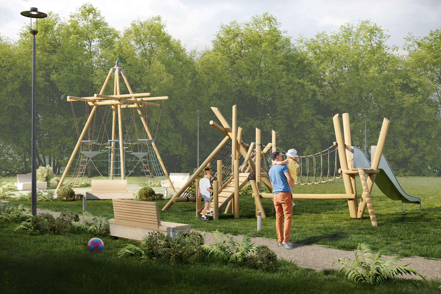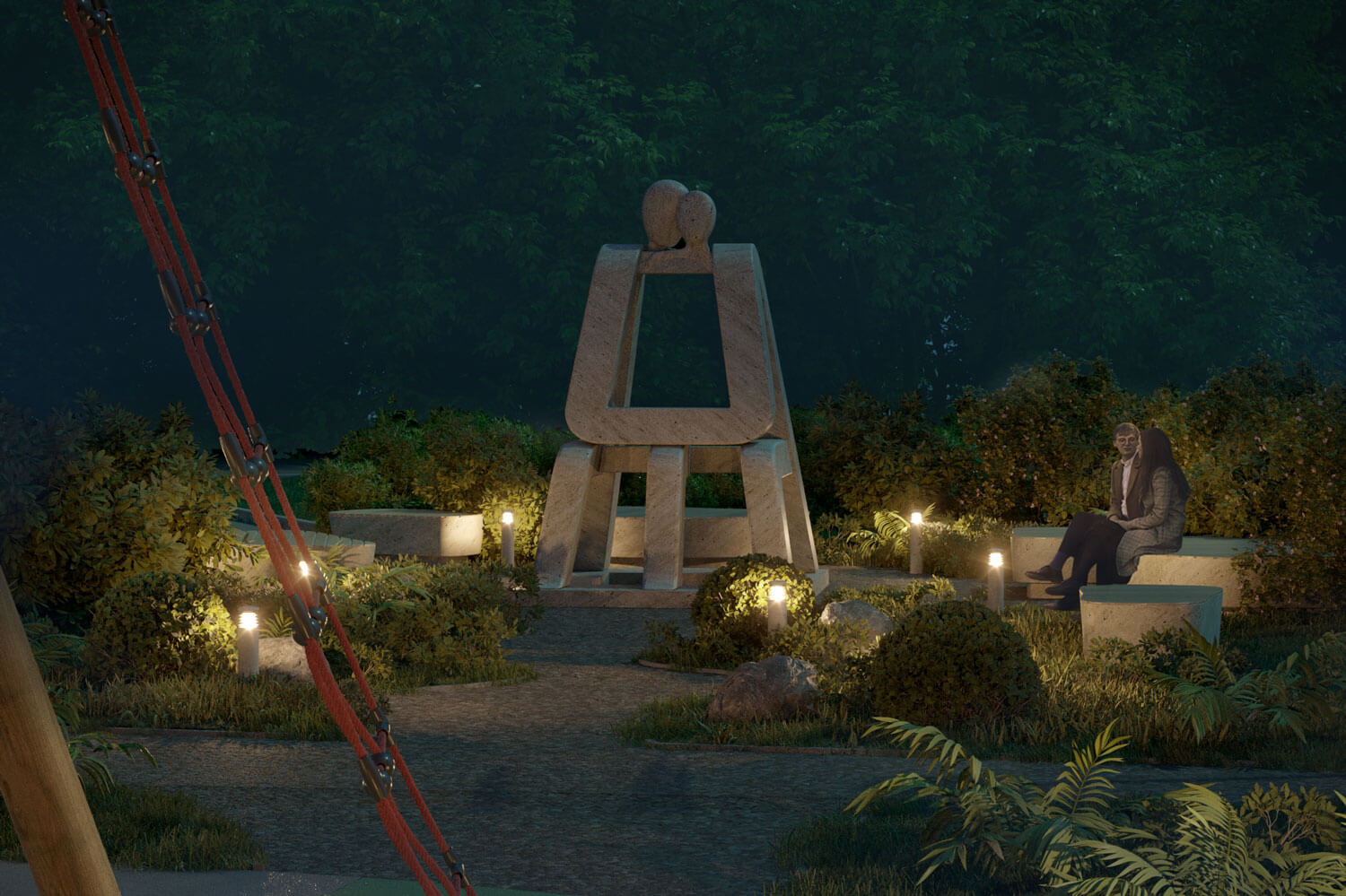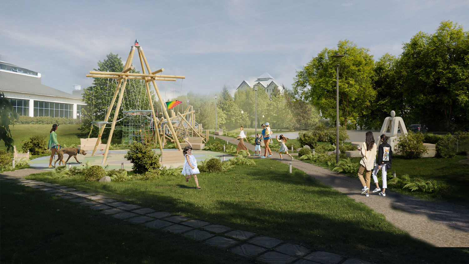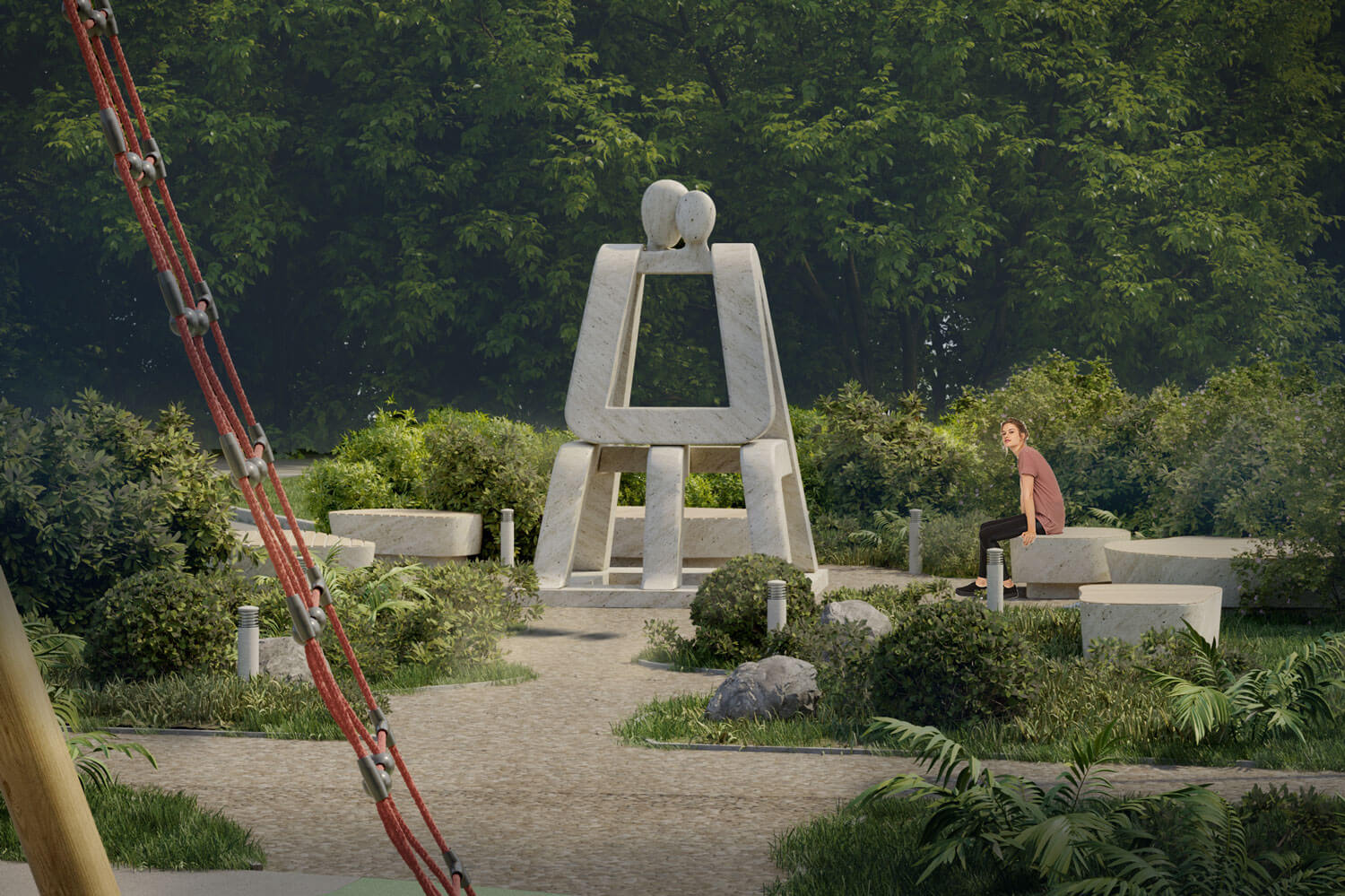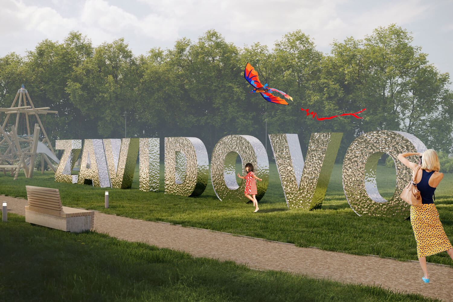 В новой благоустроенной среде найдётся место каждому, кто приедет в Завидово. Гости смогут прогуляться, насладиться видами на скульптуру с разных точек обзора, поиграть на детской площадке, сфотографироваться на фоне текстового арт-объекта ZAVIDOVO. Главный смысловой центр композиции – это скульптура, она, как олицетворение семьи, дома и природы является главной художественной ценностью данной благоустроенной территории. Вокруг скульптуры располагаются удобные эргономичные лавочки, парковое освещение и ландшафтные группы озеленения. На втором плане композиции, напротив скульптуры, находятся игровые площадки Башня и Городок для детей среднего и младшего возрастов. И на третьем плане, на пути движения к главным центрам притяжения, располагается текстовой арт-объект ZAVIDOVO, бликуя в светлое время суток и подсвеченный яркими софитами, когда наступает вечер. Концепция благоустройства предусматривает мощение прогулочной зоны тротуарной плиткой, установку уличного освещения трёх типов – встроенные в дорожку точечные светильники, парковые светильники высотой 1 м и высокие фонари высотой 2,5 м. Основные используемые материалы в данном проекте – это известняк, дерево, нержавеющая сталь, мощение каменной брусчаткой, на детских игровых площадках применяется пластик, синтетическая нить, прорезиненное покрытие и пластик. При озеленении данной территории предлагаем использовать кустарники барбариса, скумпию и хвойники шаровидных сортов.