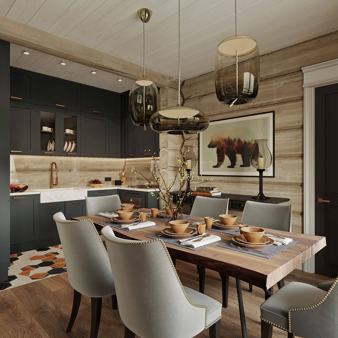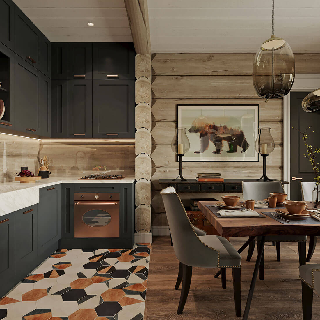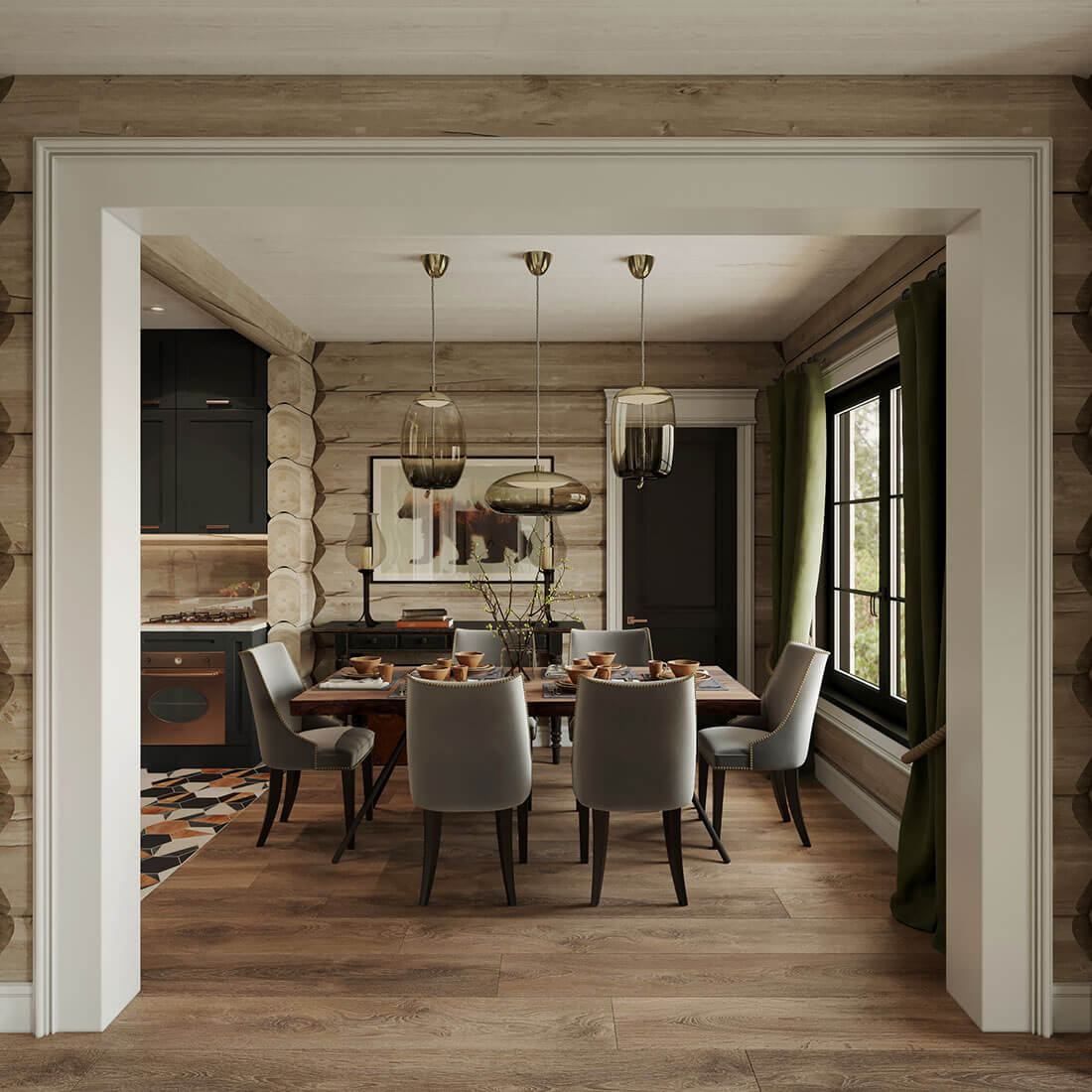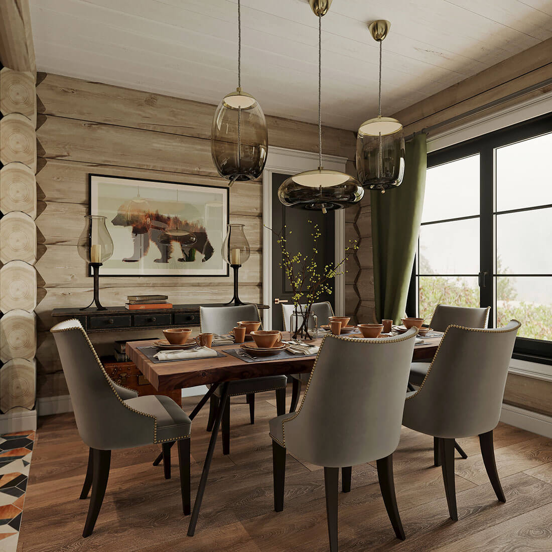 Дом из кедрового лафета, каждый сантиметр в нем — ручная работа, задачей интерьера стало поддержать это.