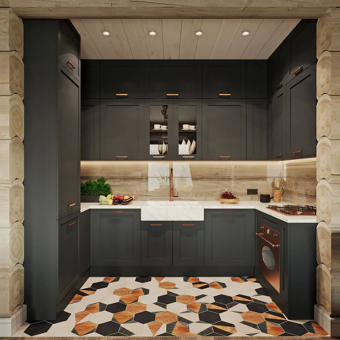 Фартук на кухне выполнен из стекла, сквозь которое видно деревянную стену. Это практичное и одновременно стильное решение пришло в голову дизайнеру, как только он узнал, что материалом для дома служит кедр, ведь это дерево имеет ярков выраженную текстуру, и закрывать такую красоту было бы неверно.