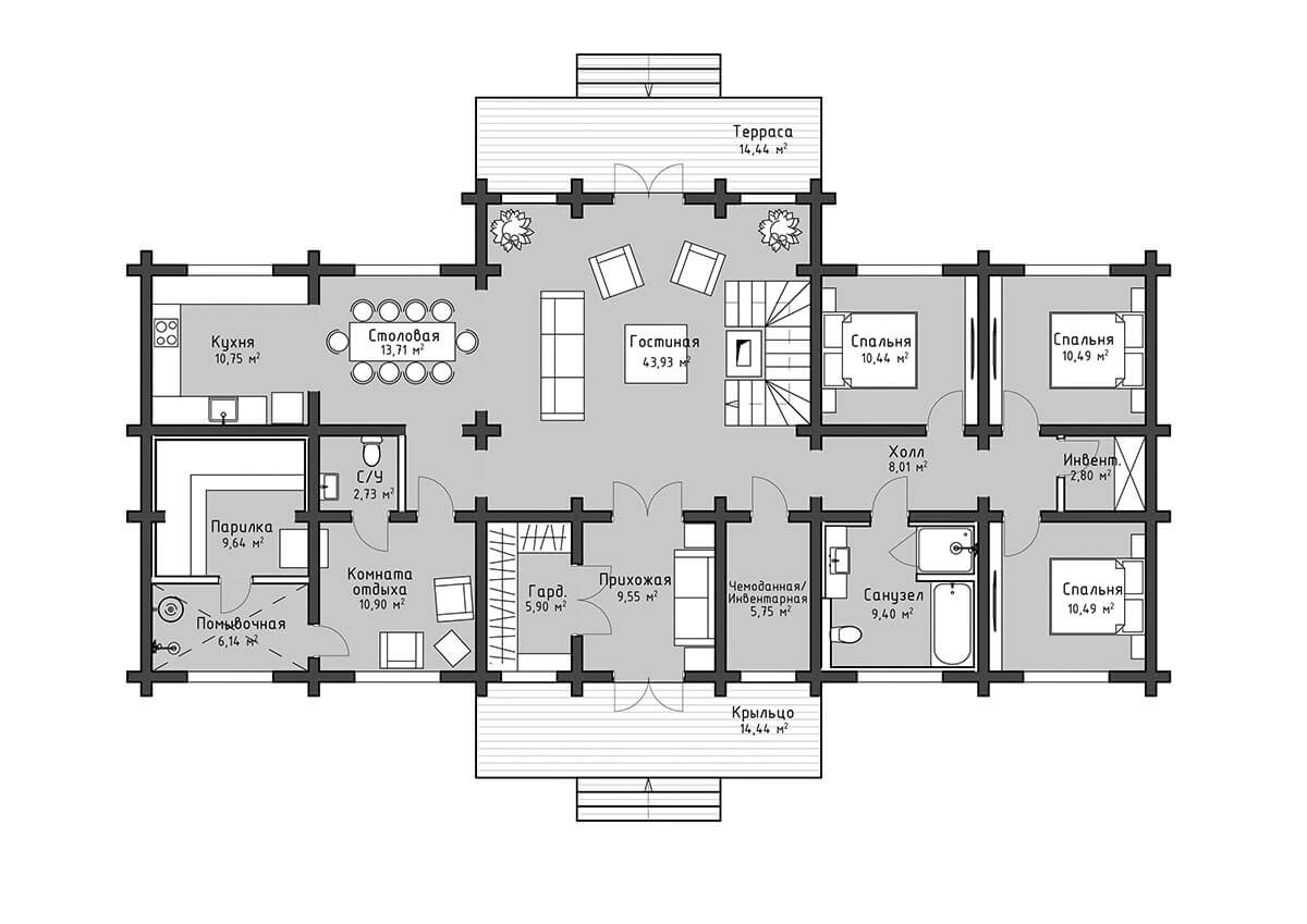 Дом и интерьер спроектированы для семейной пары с двумя взрослыми детьми, у которых уже есть свои семьи.
