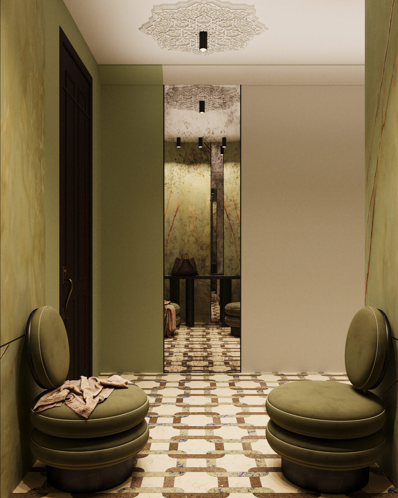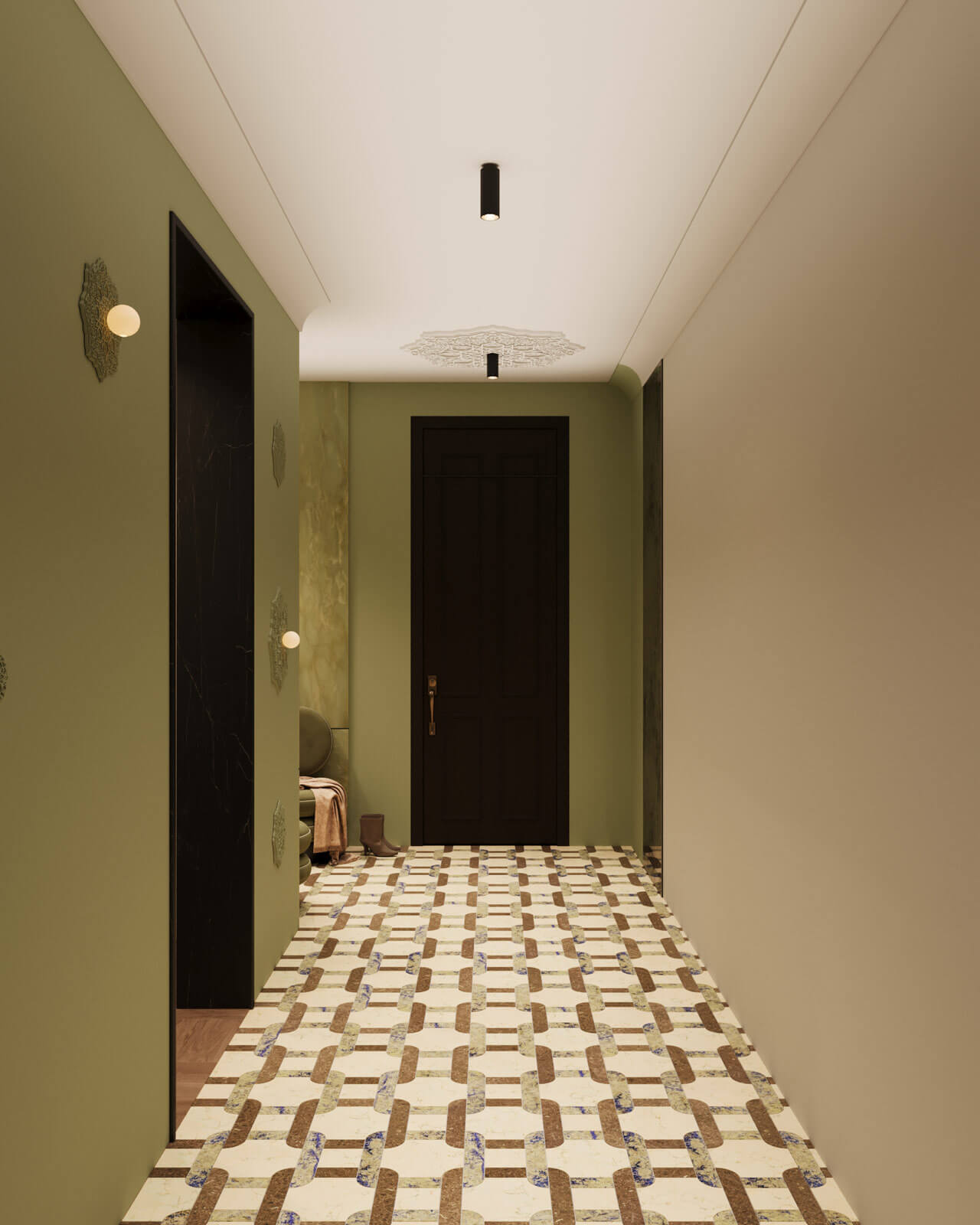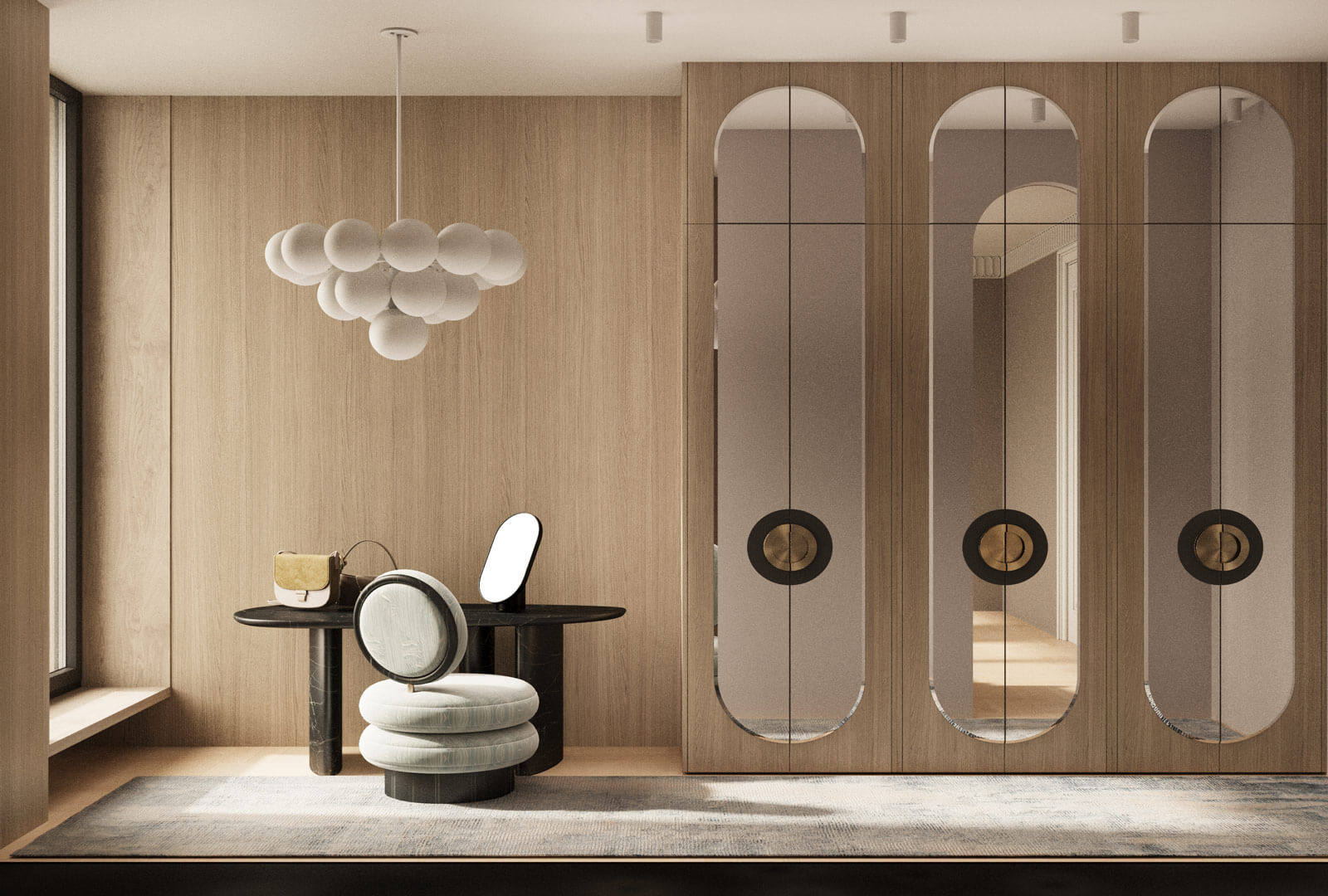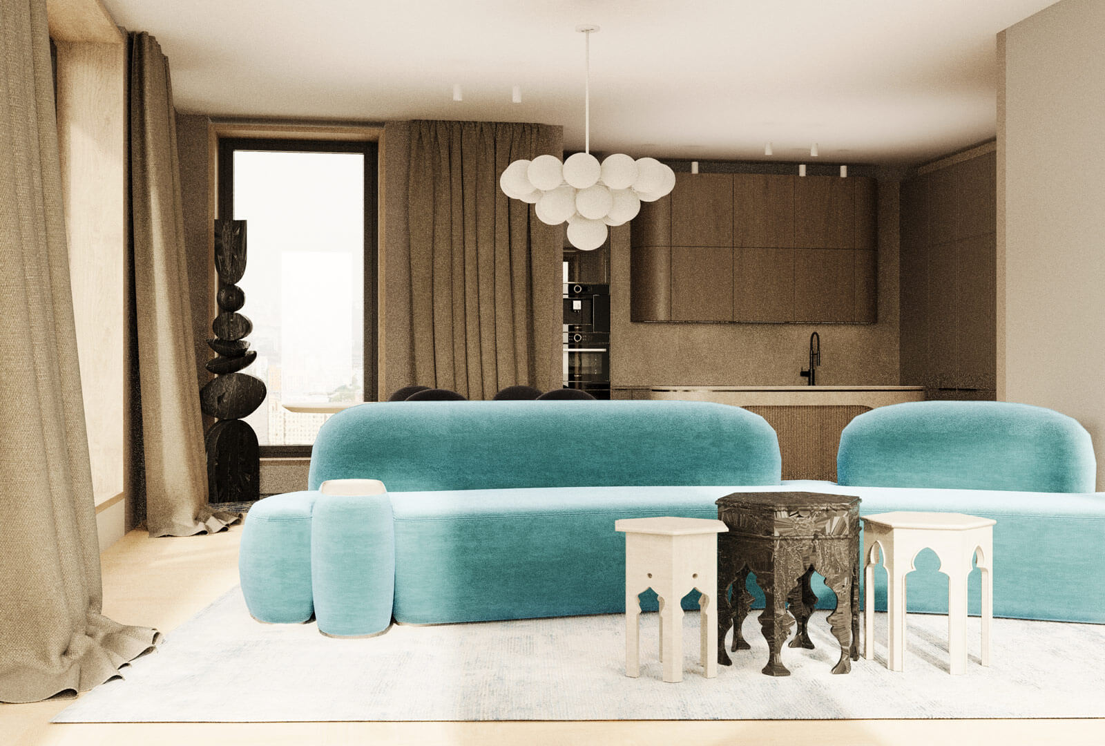 Проект интерьера квартиры воплощает в себе гармоничное сочетание элегантности модерна и экзотической чувственности марокканского стиля, создавая уникальный фьюжн. Концепция основана на создании динамичного, но уютного пространства, где современные линии и функциональность модерна переплетаются с богатой текстурой и яркими красками Марокко.