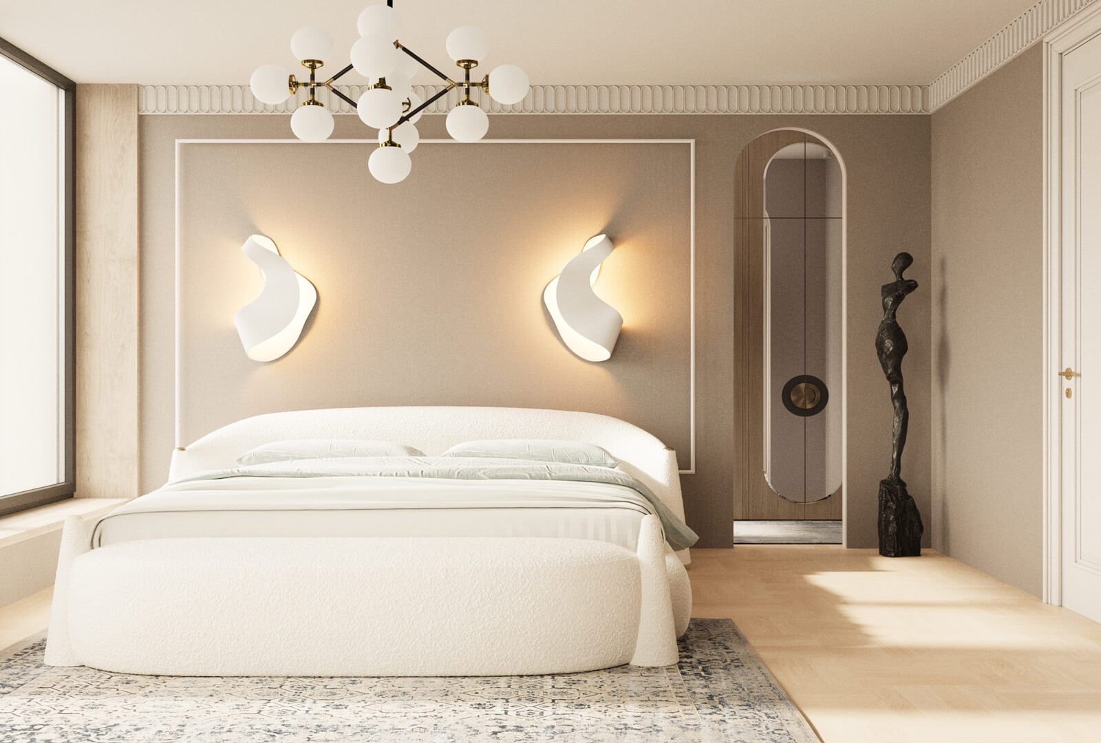 Принципы построения интерьера основываются на контрасте и балансе. Прямые линии и лаконичные формы модерна служат фоном для изысканных марокканских элементов. Открытое пространство гостиной визуально расширяется за счет использования светлых тонов, а зонирование достигается с помощью текстиля, мебели и декоративных элементов. В спальне, напротив, царит более интимная атмосфера, созданная за счет мягкого, приглушенного освещения и богатой текстильной отделки.