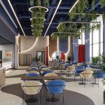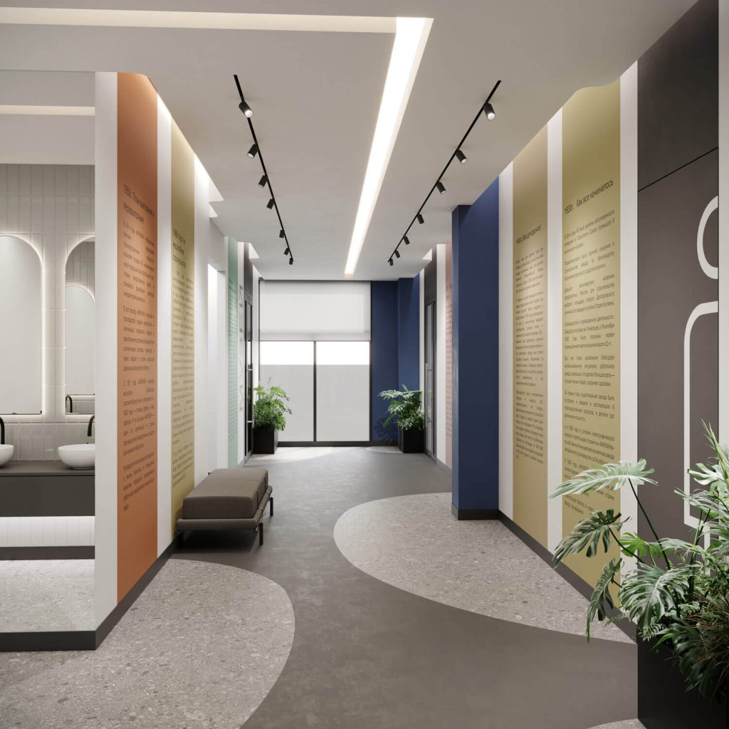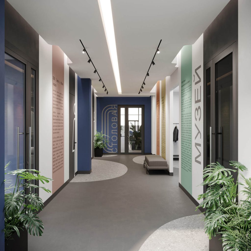 Доминантой оформления служит потолок, стилистически разбитый на функциональные зоны посредством геометрии световых линий и озеленения. Характерная особенность — подвесные конструкции, формирующие зелёный потолочный «ландшафт». Такое решение не только внедряет природный акцент, но и способствует формированию комфортной акустической среды.