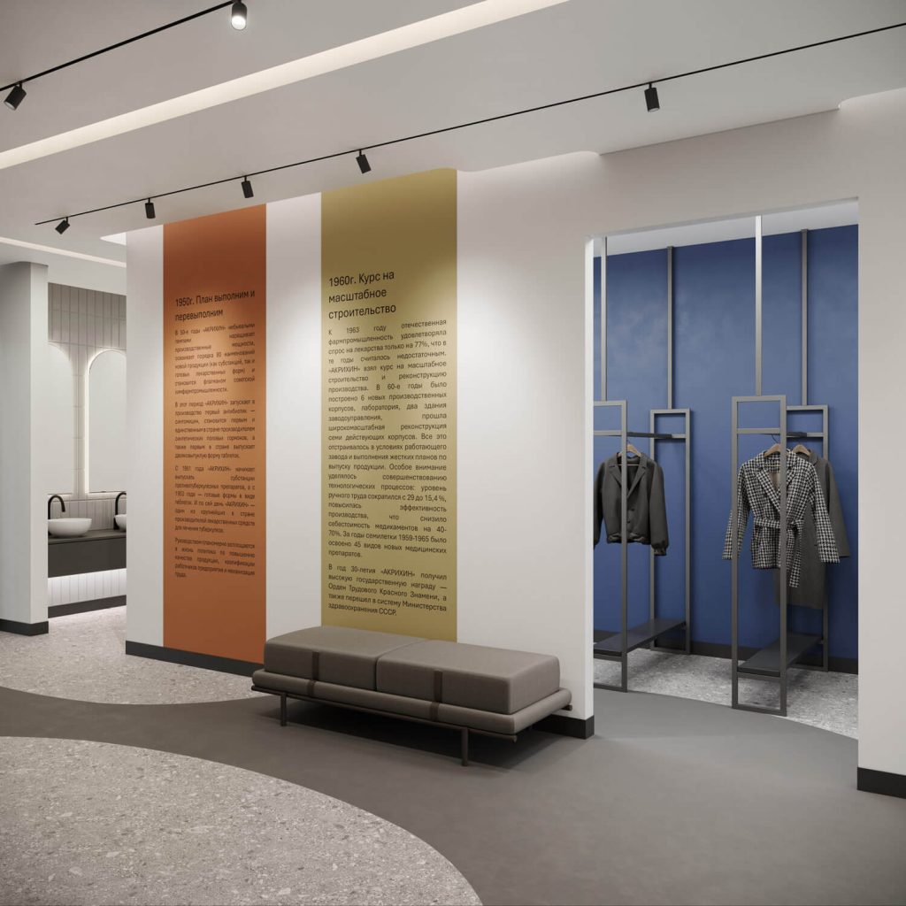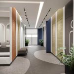 Стены и вертикальные объемы отделаны декоративной штукатуркой с матовой и сатинированной текстурой, сочетающейся с натуральными деревянными панелями. Организующие элементы интерьера — арочные и круговые ниши, подчёркнутые интегрированной LED-подсветкой, — придают пространству ритмичность и динамику. Фрагменты стен выполнены с использованием зеркальных поверхностей, что визуально расширяет помещение, усиливает эффект глубины и способствует интерактивной игре света.