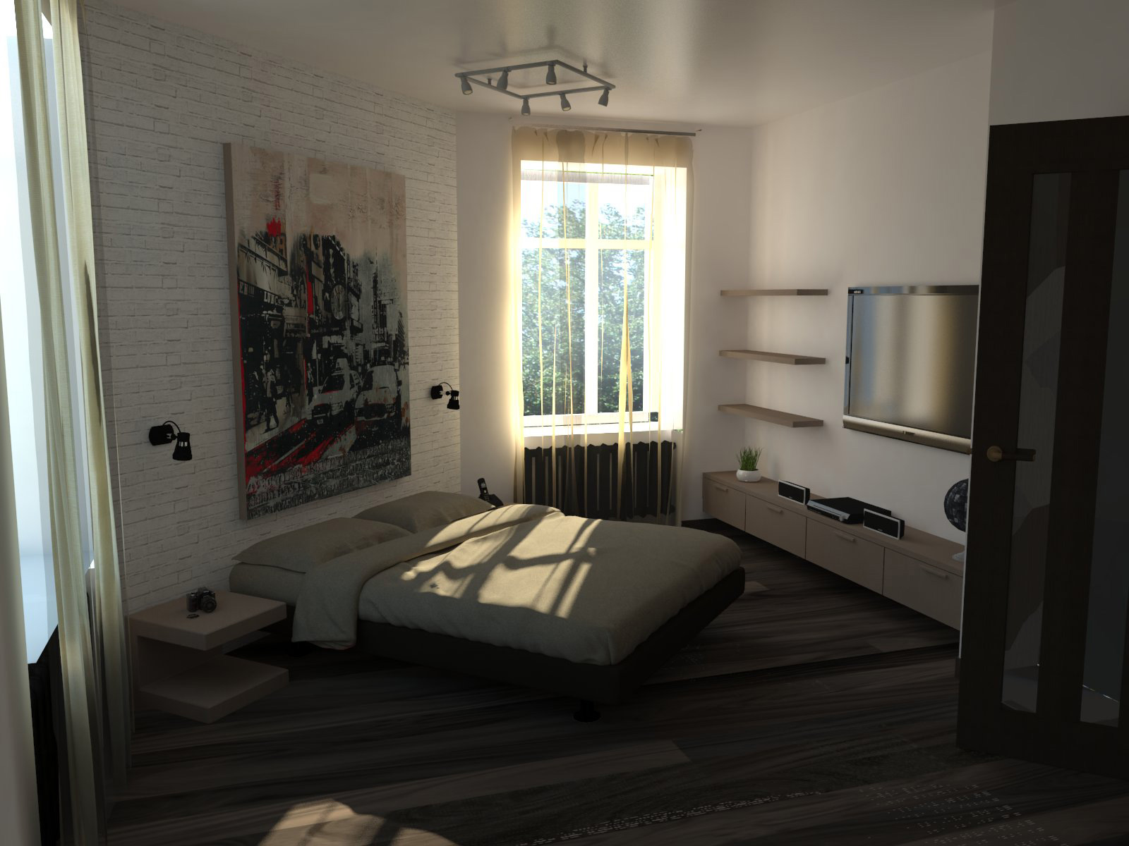 Проект интерьера выполнен в стиле лофт. Зона сна и отдыха изолирована от столовой-гостиной перегородкой. В спальне имеется гардеробная, из которой есть отдельный вход в ванную комнату. Корпусная мебель для хранения вещей и кровать изготовлены из дерева.