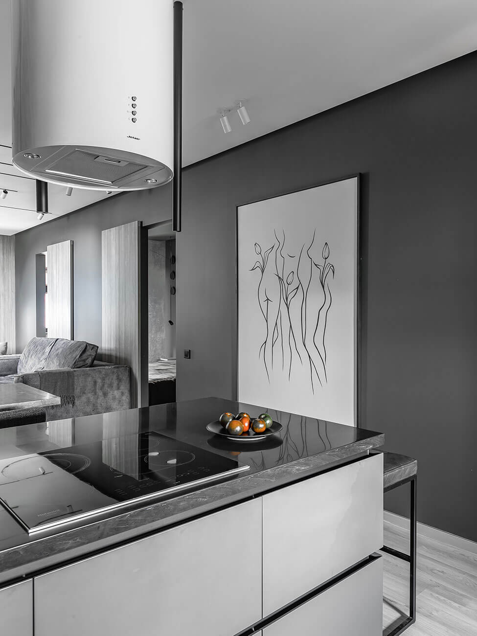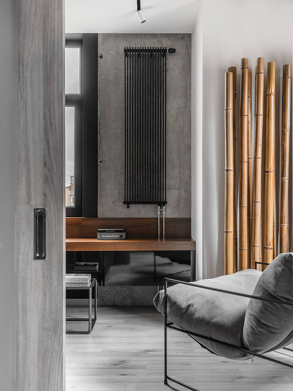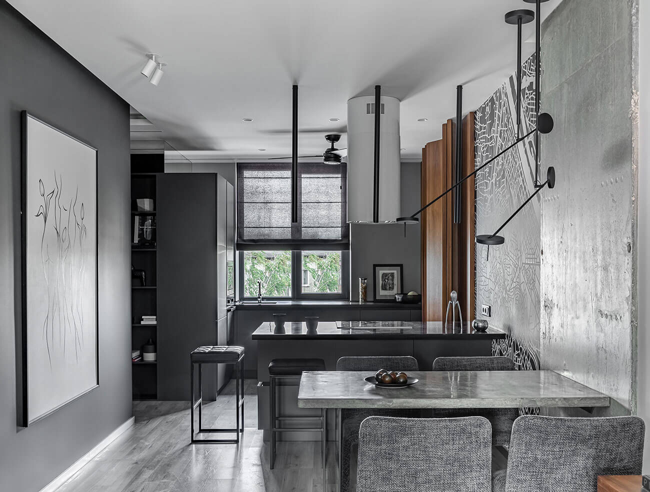 В основе интерьера — конструктивные, максимально функциональные решения и строгие линии. Преобладают темные цвета холодных оттенков, которые согласуются с бетонными поверхностями колонн. Конструктивные элементы квартиры оставили нетронутыми и покрыли лаком. Акцент на фактурах играет важную роль во всем интерьере.