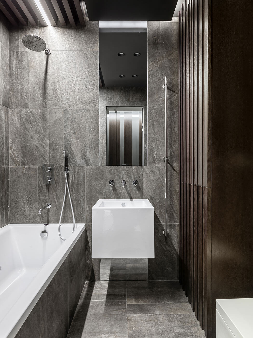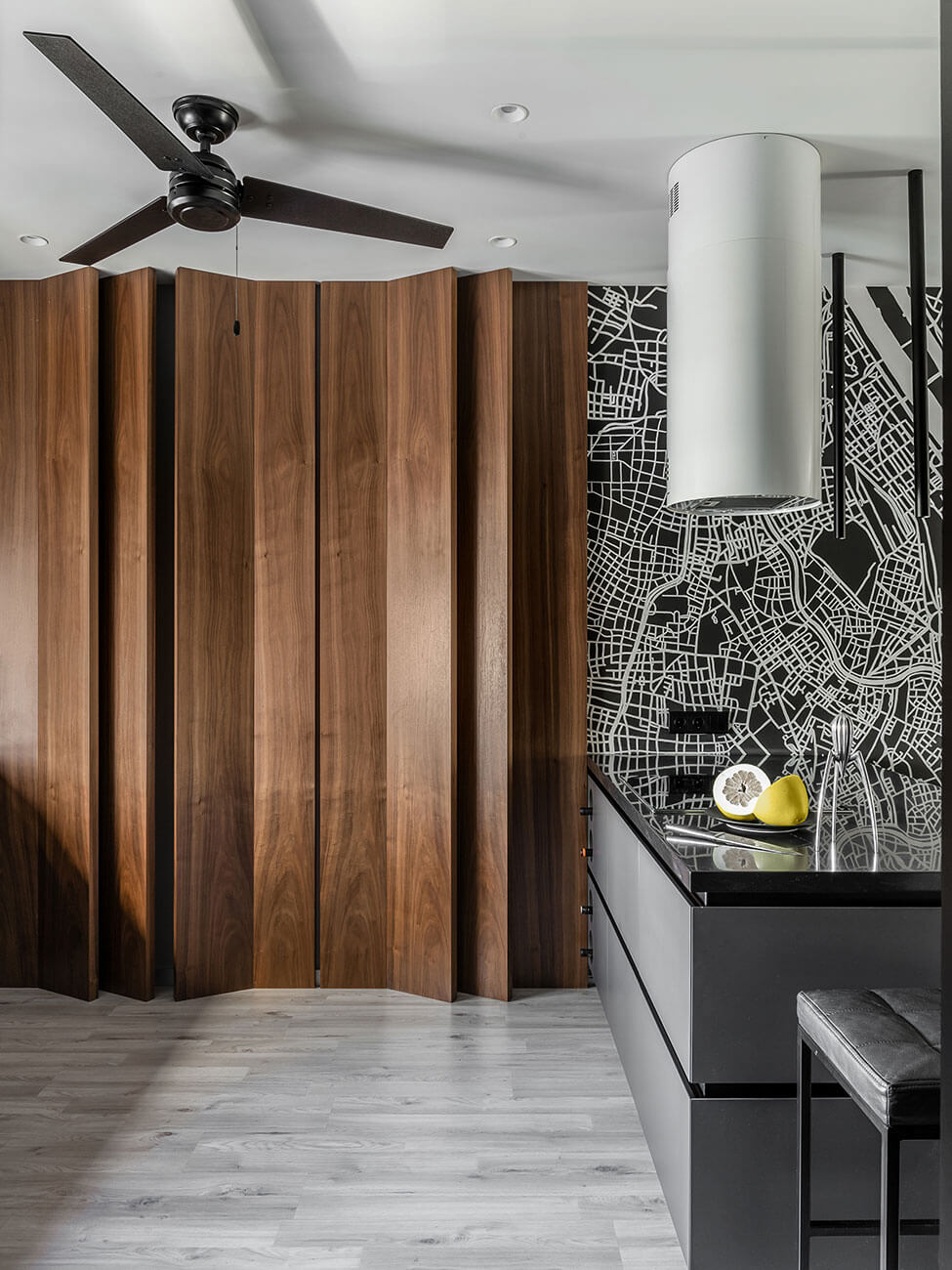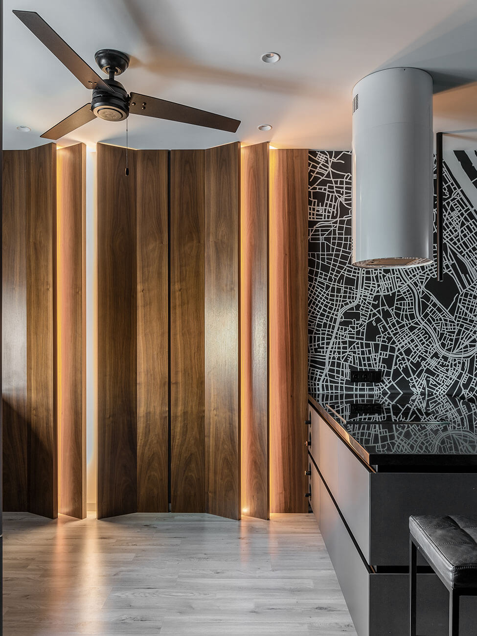 Деревянные декоративные панели видно из разных уголков квартиры — дерево и теплая подсветка придают холодному и темному интерьеру уют.