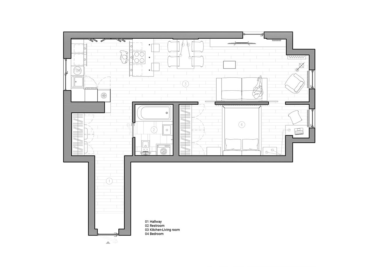 В ходе перепланировки кухню объединили с гостиной. Из-за формы квартиры кухня-гостиная получилась вытянутой: эту особенность пространства использовали, чтобы линейно разместить все функциональные зоны. Спальня получилась необычной благодаря особенностям планировки — в ней две двери по краям кровати.