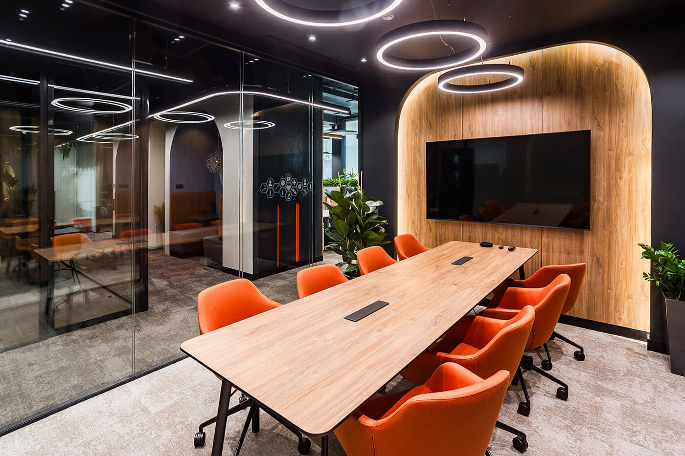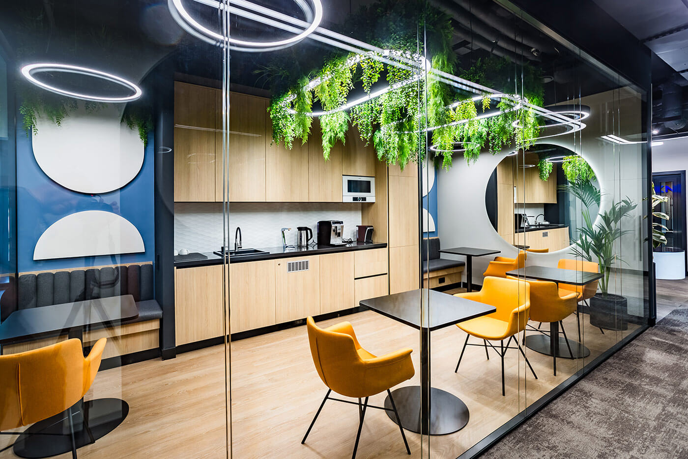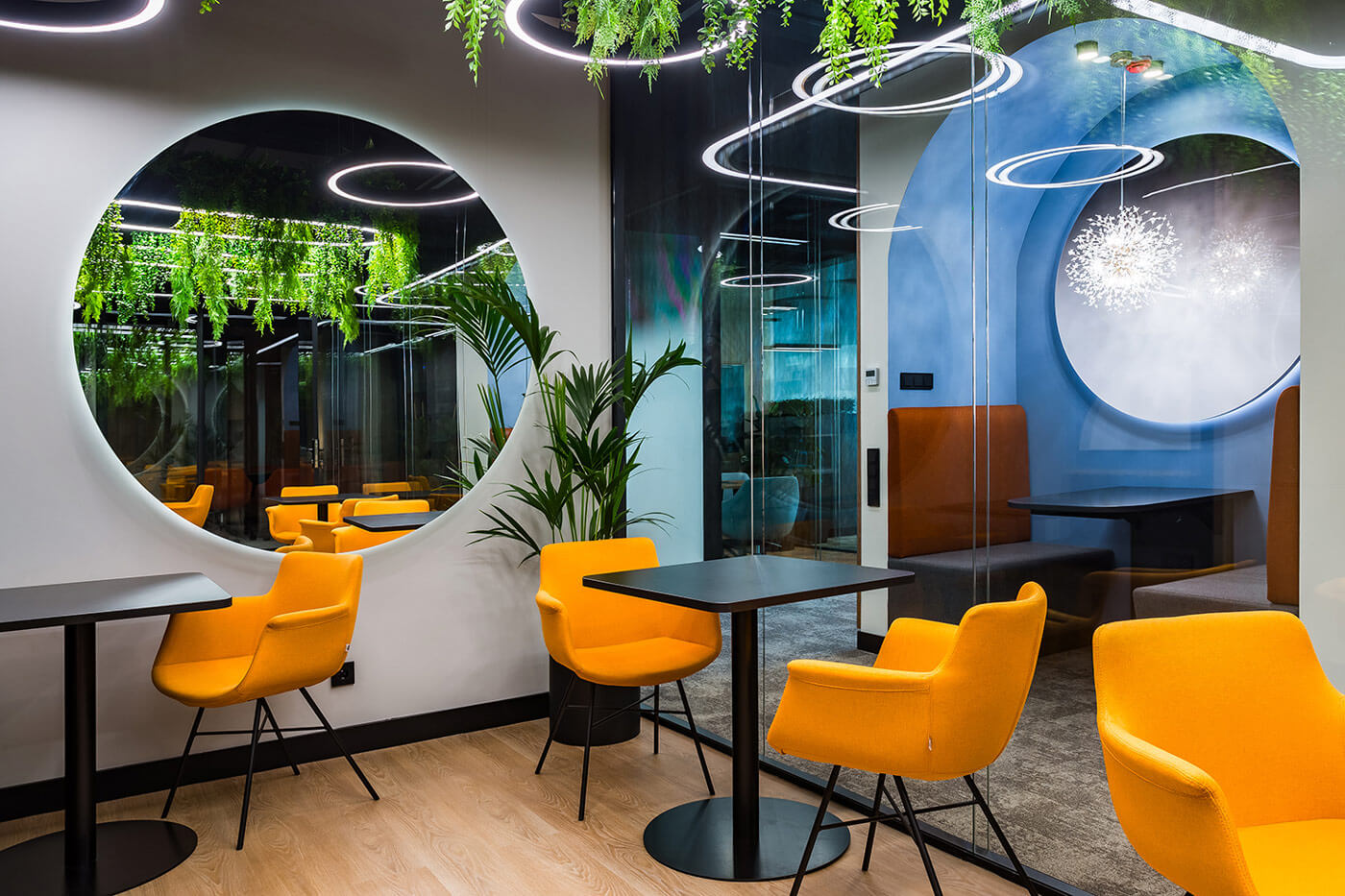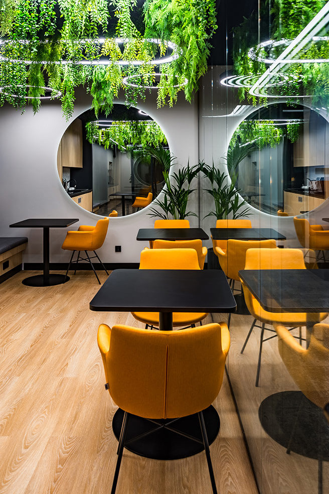 В интерьере доминирует элегантный союз натурального дерева (панельные ламели, облицовка мебельных фасадов, акцент на отделку стен) и индустриального тёмного цвета, присутствующего на потолочных конструкциях и некоторых опорных элементах, взятых из архитектурного кода бизнес-центра. Дерево визуально «смягчает» пространство, создавая ощущение теплоты и уюта, в то время как тёмные поверхности подчеркивают современный характер офиса. В качестве напольного покрытия применяется ковровая плитка с переходом текстур и оттенков – тёплая серая гамма разбавлена локальными цветными акцентами, что поддерживает идею динамики и гибкости.Зеркальные элементы, интегрированные в настенное оформление, решают сразу две задачи: во-первых, визуально расширяют пространство, нивелируя компактность некоторых зон, а во-вторых, архитектурно «разыгрывают» ритм мягкой посадкой и приглушённым светом. Здесь реализована ключевая концепция — соединение стран через природу: флористические элементы между арками, живые растения, интегрированные в мебельные модули и подвесные композиции, способствуют ощущению экологичности и гармонии. Световые круговые инсталляции на потолке перекликаются с формой арок, усиливая тематическую целостность пространства.