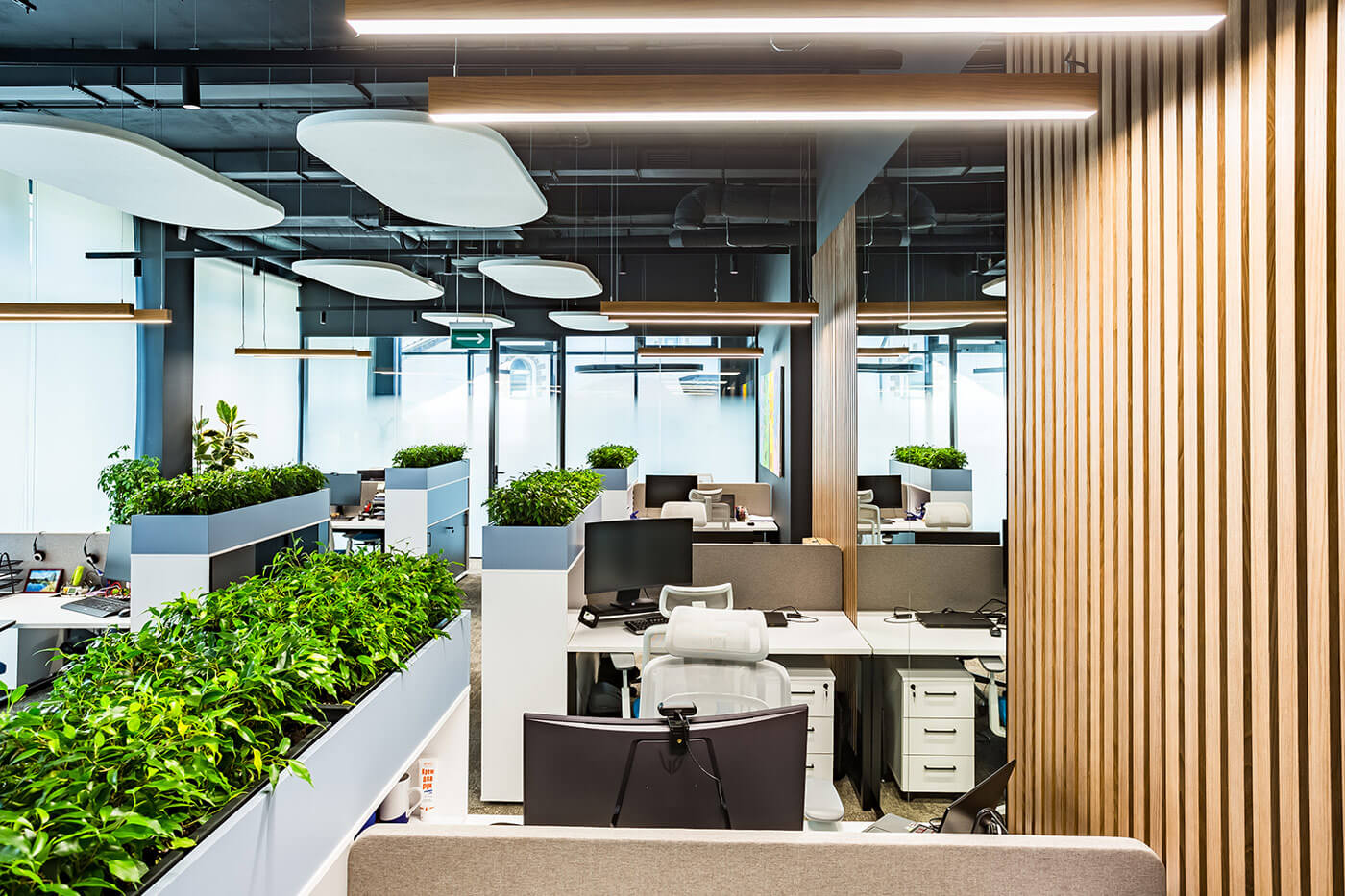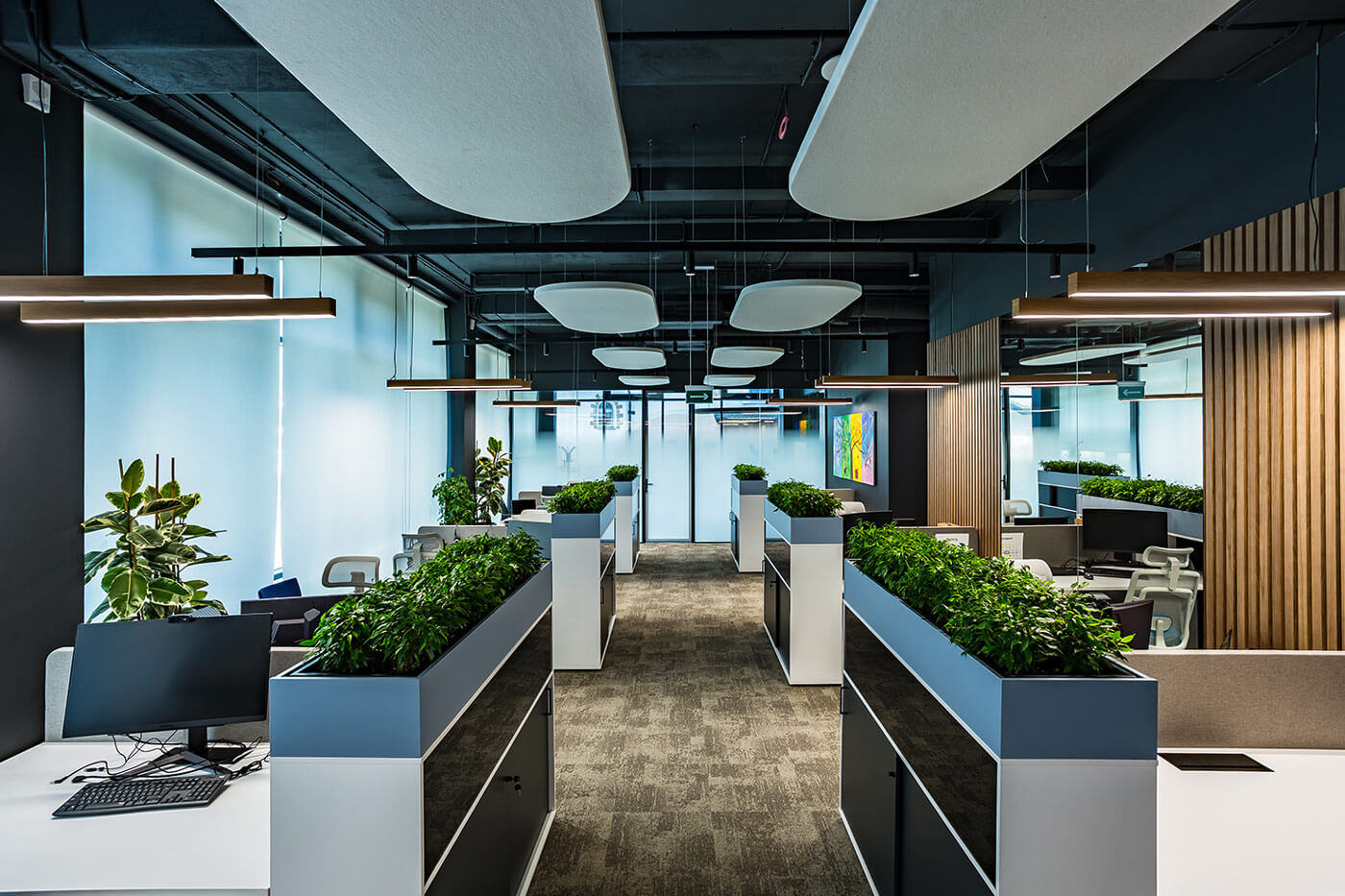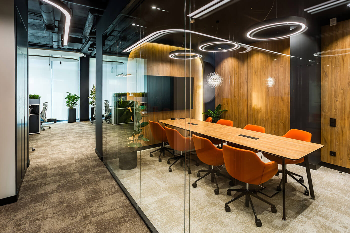 В интерьере доминирует элегантный союз натурального дерева (панельные ламели, облицовка мебельных фасадов, акцент на отделку стен) и индустриального тёмного цвета, присутствующего на потолочных конструкциях и некоторых опорных элементах, взятых из архитектурного кода бизнес-центра. Дерево визуально «смягчает» пространство, создавая ощущение теплоты и уюта, в то время как тёмные поверхности подчеркивают современный характер офиса. В качестве напольного покрытия применяется ковровая плитка с переходом текстур и оттенков – тёплая серая гамма разбавлена локальными цветными акцентами, что поддерживает идею динамики и гибкости.Зеркальные элементы, интегрированные в настенное оформление, решают сразу две задачи: во-первых, визуально расширяют пространство, нивелируя компактность некоторых зон, а во-вторых, архитектурно «разыгрывают» ритм мягкой посадкой и приглушённым светом. Здесь реализована ключевая концепция — соединение стран через природу: флористические элементы между арками, живые растения, интегрированные в мебельные модули и подвесные композиции, способствуют ощущению экологичности и гармонии. Световые круговые инсталляции на потолке перекликаются с формой арок, усиливая тематическую целостность пространства.