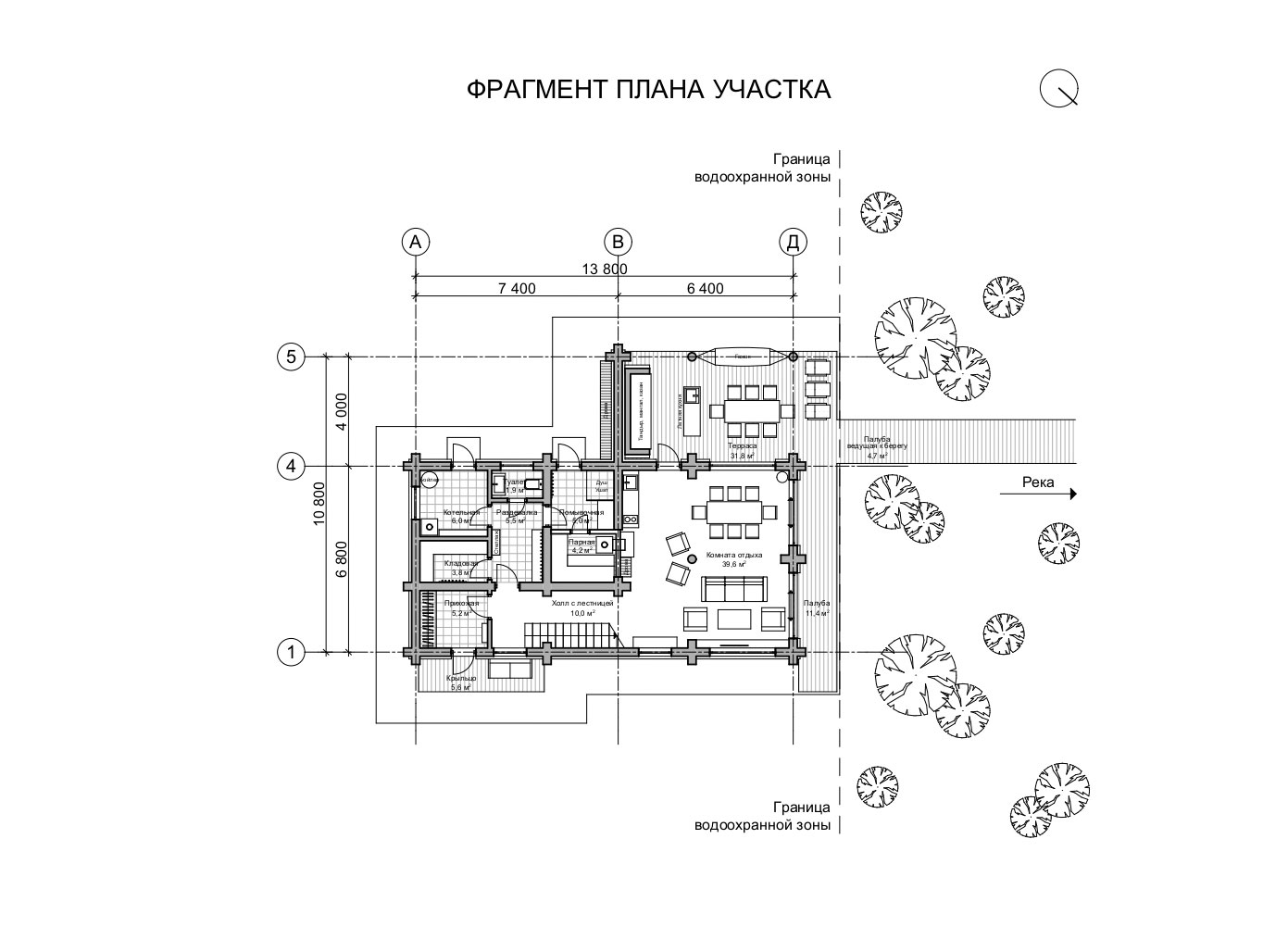 Дом-баня будет построен в деревне Новые Ченцы Ярославской области. Ровный участок с большим количеством деревьев находится на берегу Волги, а дом расположен по границе водоохраной зоны. Дом двухэтажный, с совмещенной скатной кровлей, без подвала.