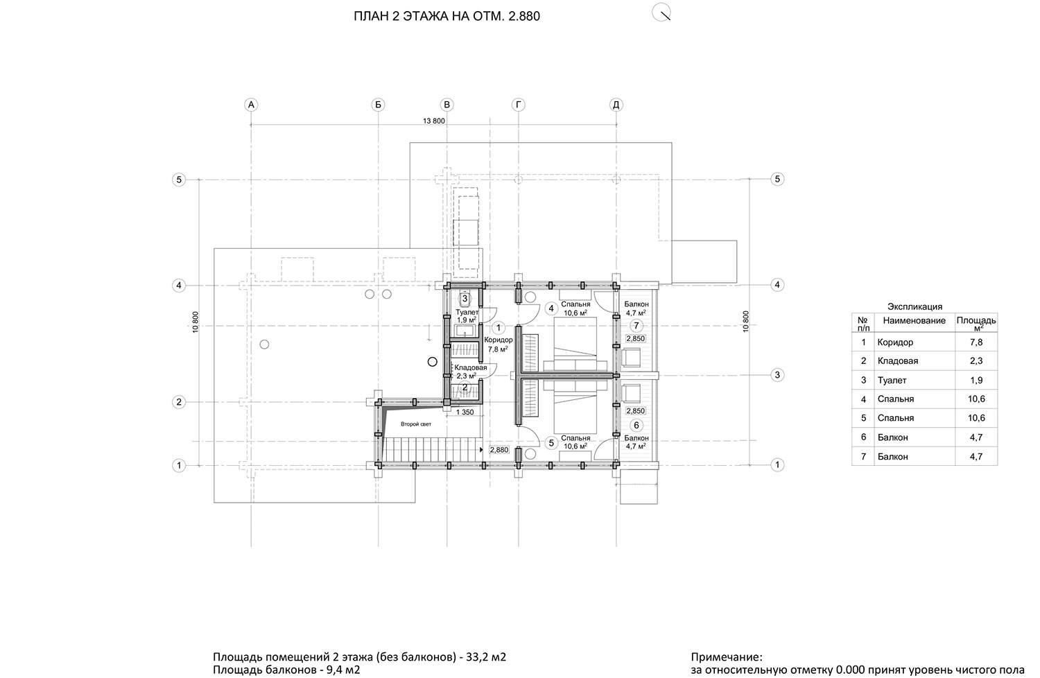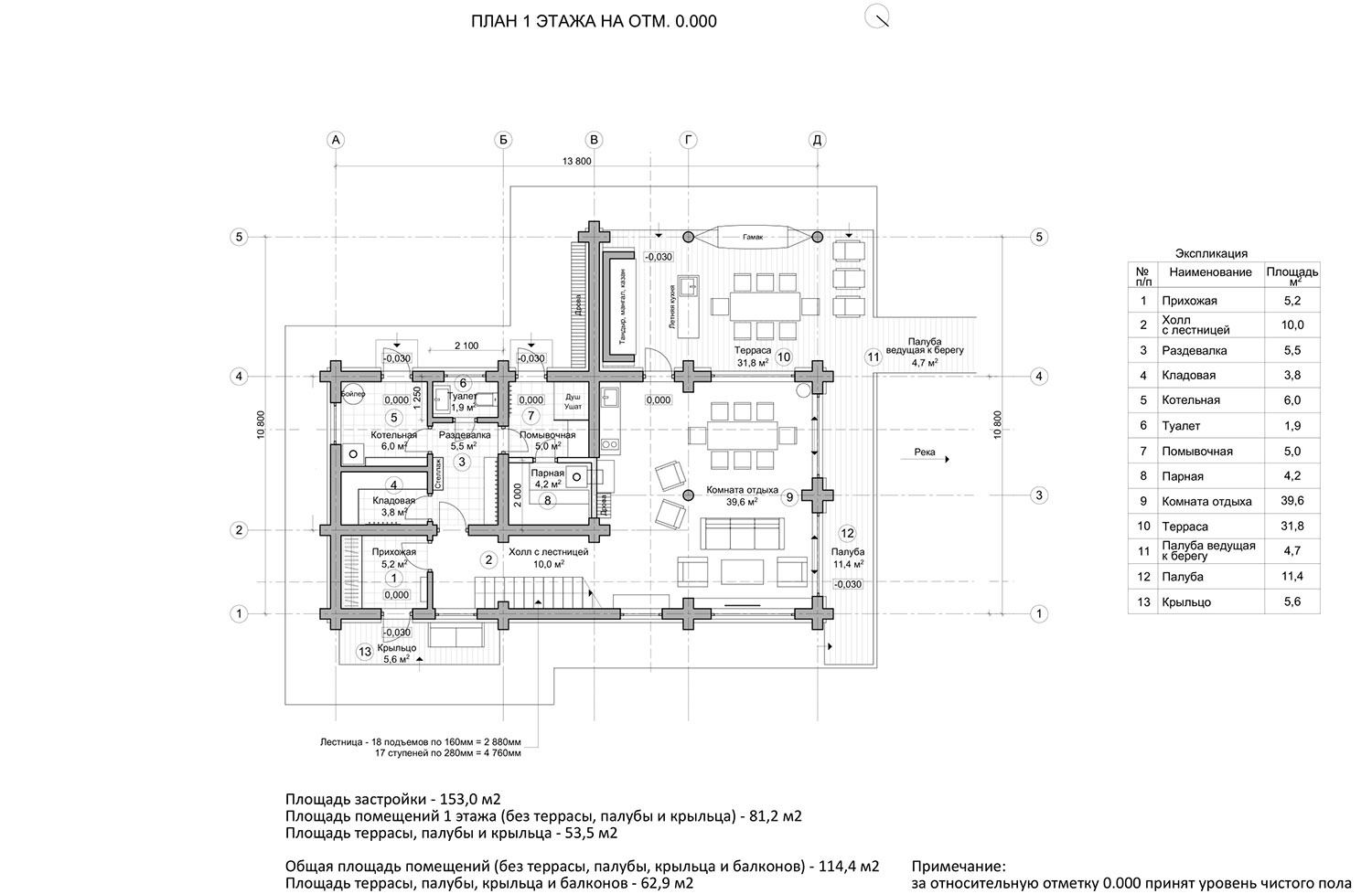 Композиционно проект состоит из двух частей — это дом и баня. Общая площадь помещений составляет 114 кв.м.