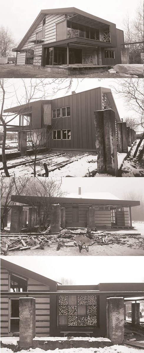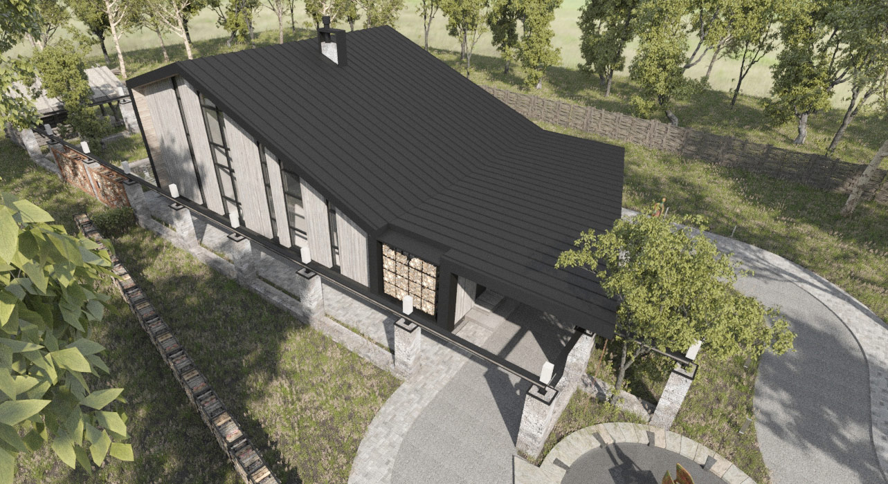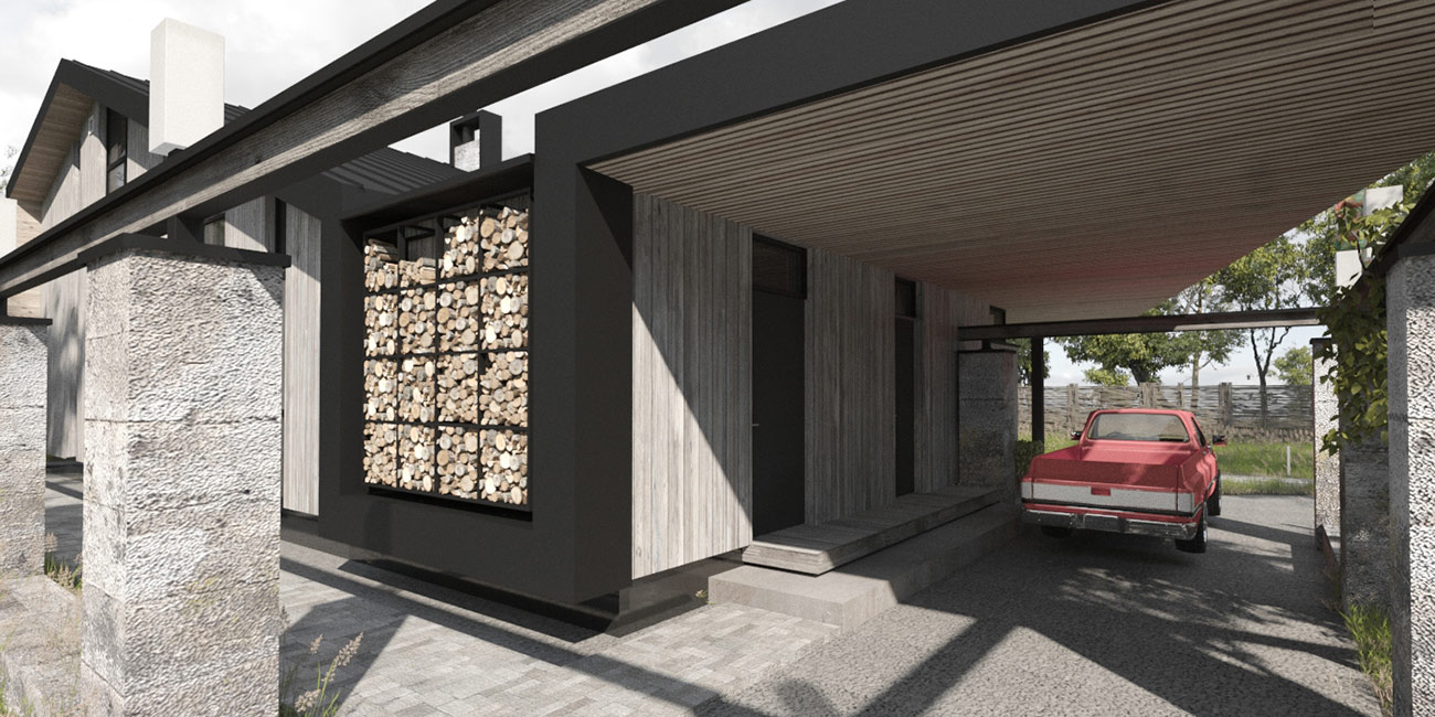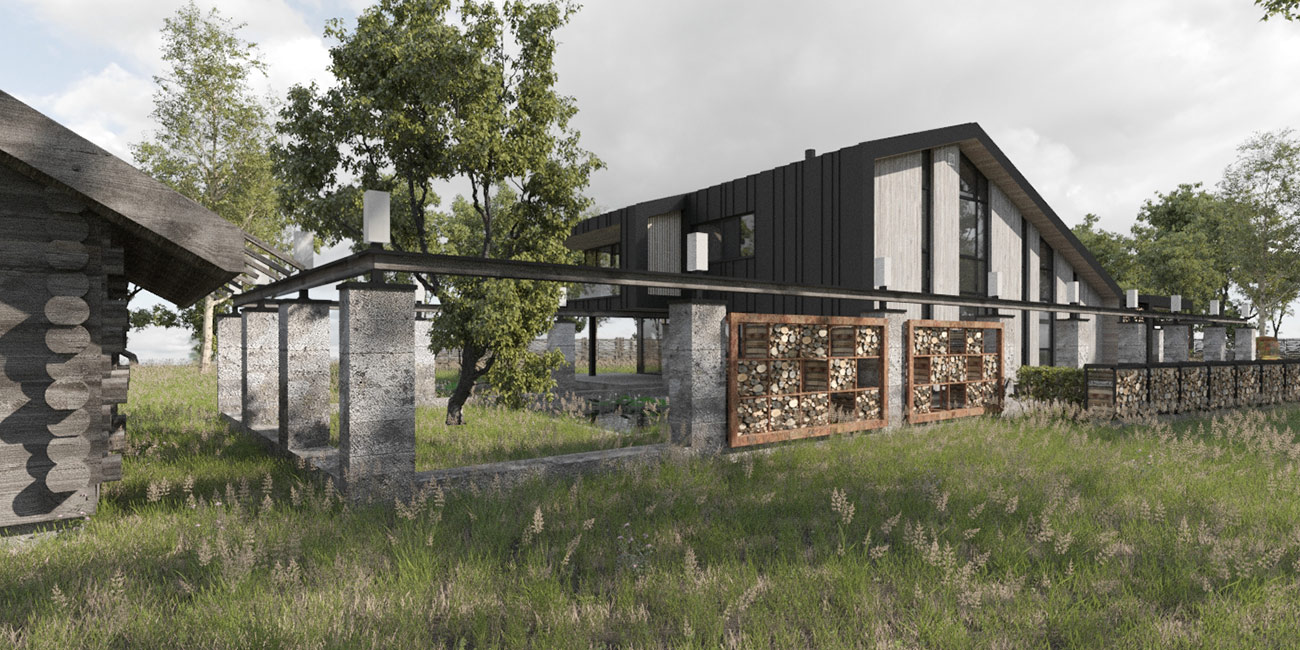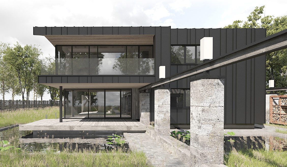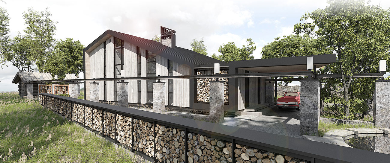 Авторы проекта сделали попытку подчеркнуть историческую идентичность места. Поросшие мхом бетонные столбы как бы очерчивают периметр застройки. Некоторые из них заходят внутрь дома, закладывая зерно для формирования интерьера. Стальная рельса узкоколейки, летящая над колоннами, графично связывает их воедино.