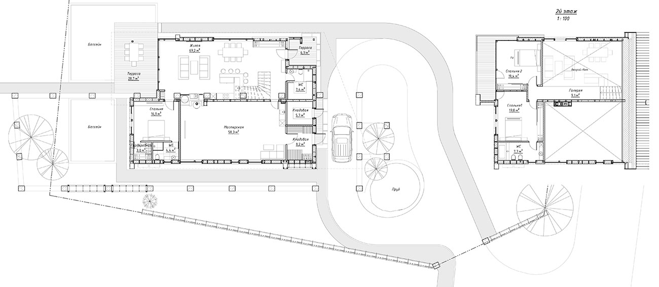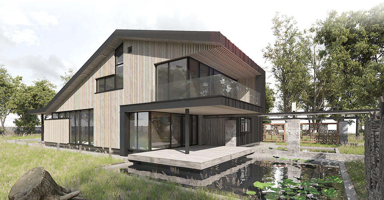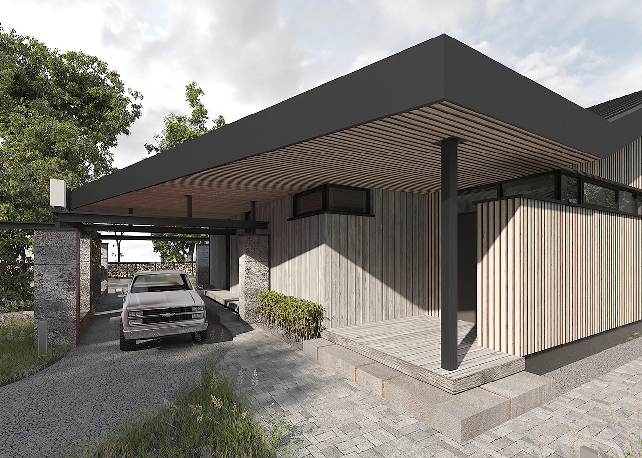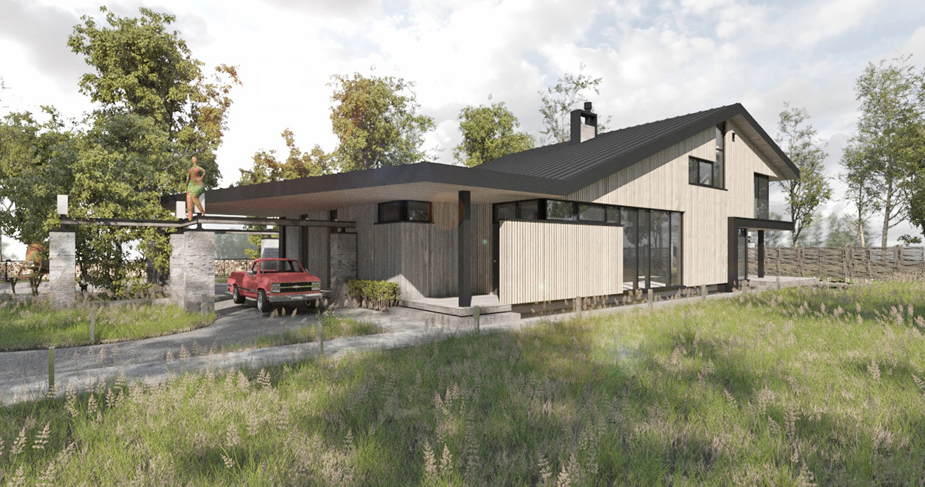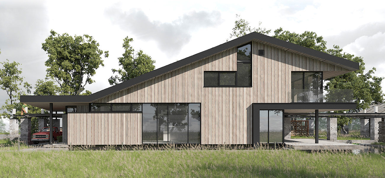 Авторы проекта сделали попытку подчеркнуть историческую идентичность места. Поросшие мхом бетонные столбы как бы очерчивают периметр застройки. Некоторые из них заходят внутрь дома, закладывая зерно для формирования интерьера. Стальная рельса узкоколейки, летящая над колоннами, графично связывает их воедино.