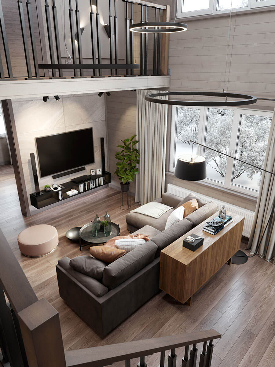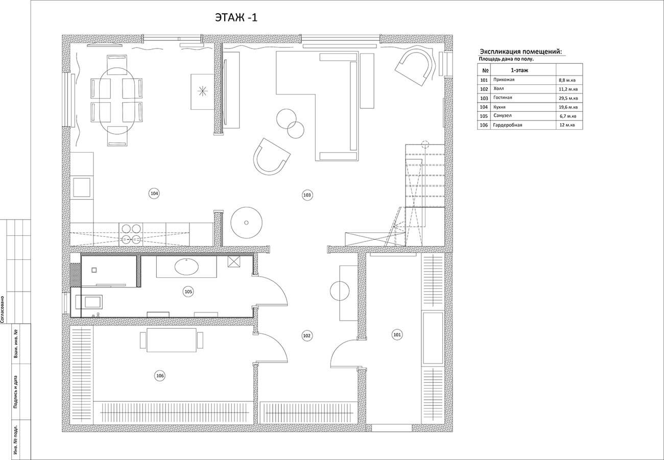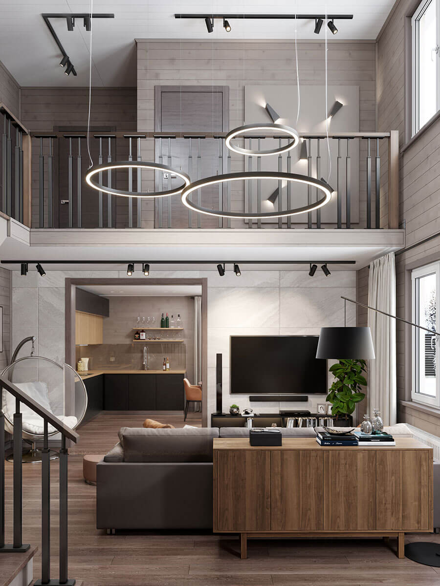 На первом этаже — большая центральная зона со вторым светом, она частично соединена с кухней широким проемом, который обрамлен порталом.