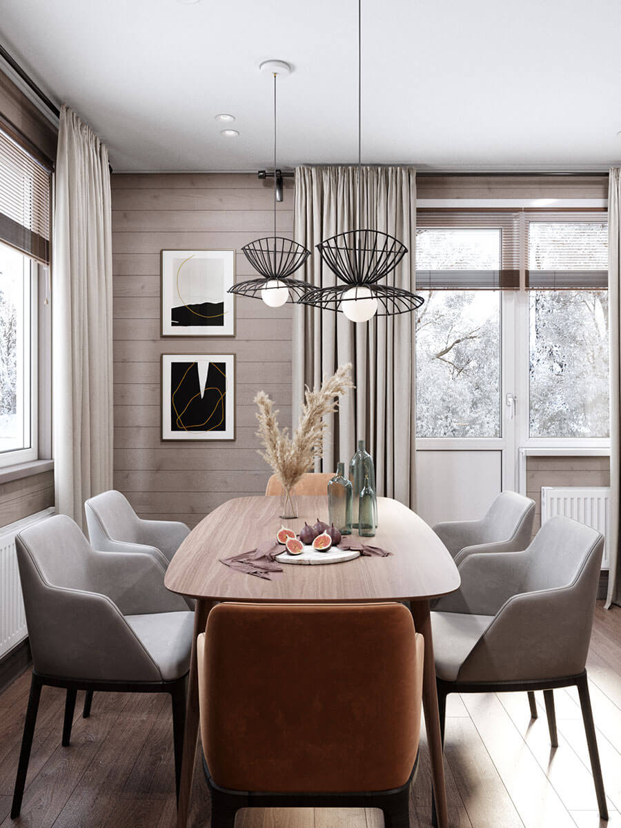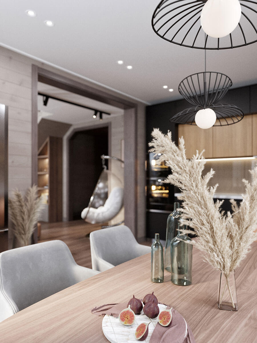Все декоративные светильники в отделке черного цвета, это придает светлому интерьеру графичности, связывается с цветом кухни.