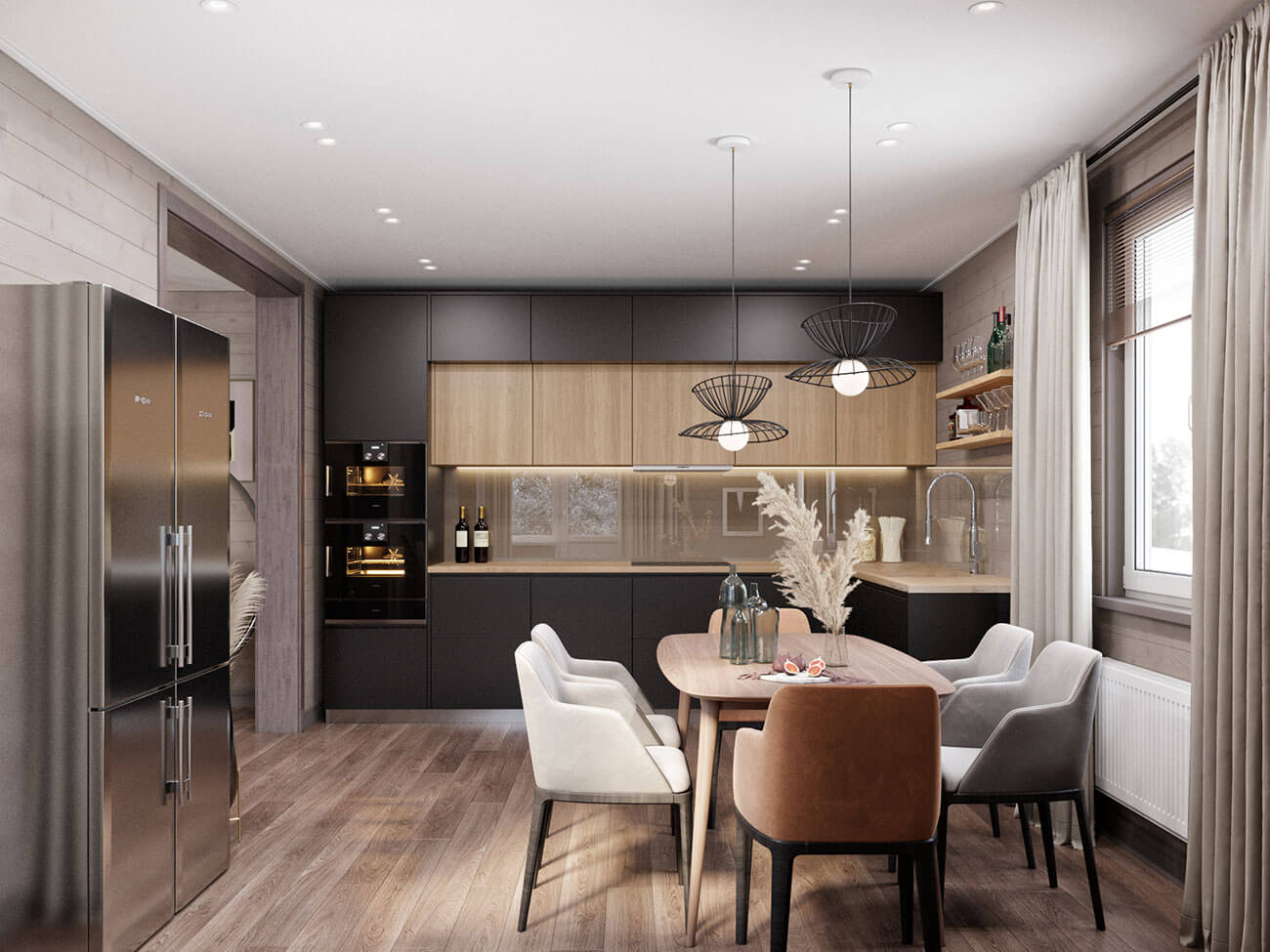 Заказчики очень хотели черную кухню в сочетании со шпонироваными фасадами. Цвет очень гармонично вписался в интерьер.