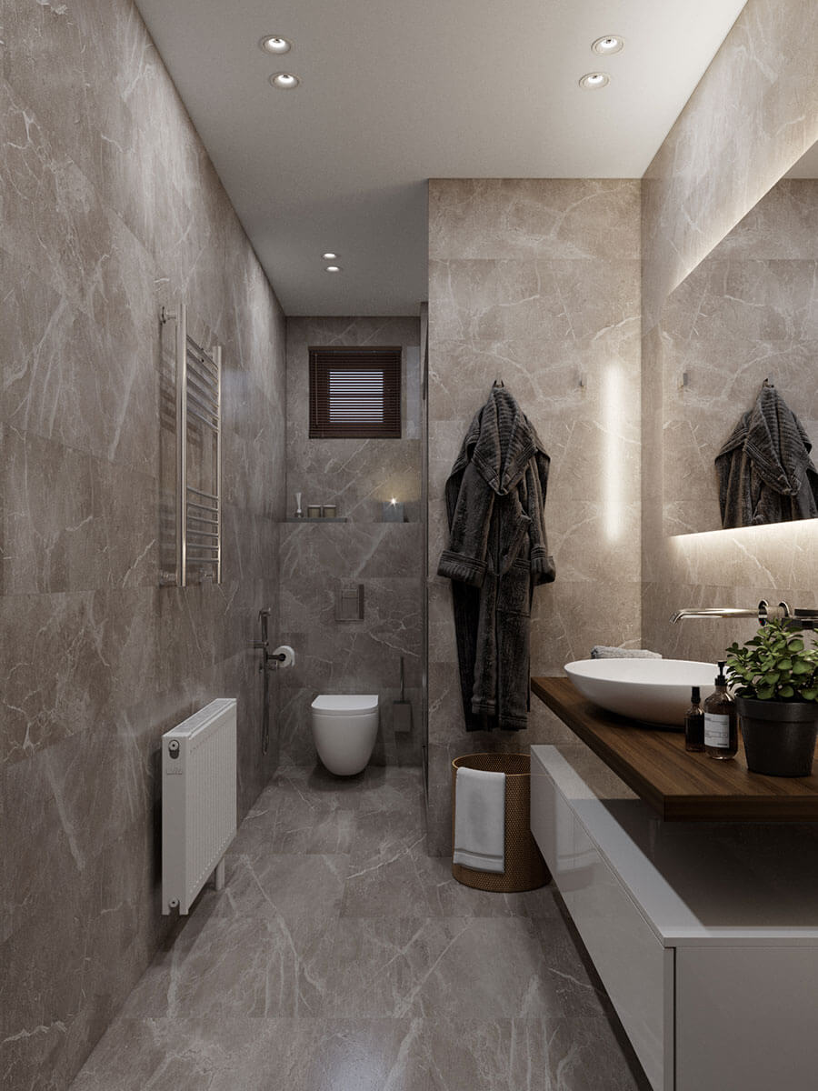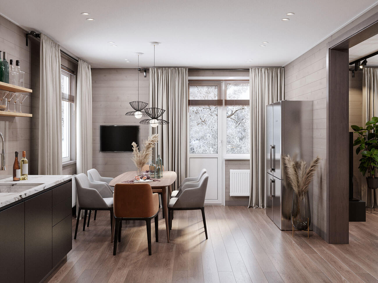 Несмотря на имеющиеся в интерьере темные детали (темная кухня, стена из брутального керамогранита, темная плитка в с.у.) — пространство получилось довольно легкое, модное и органичное.