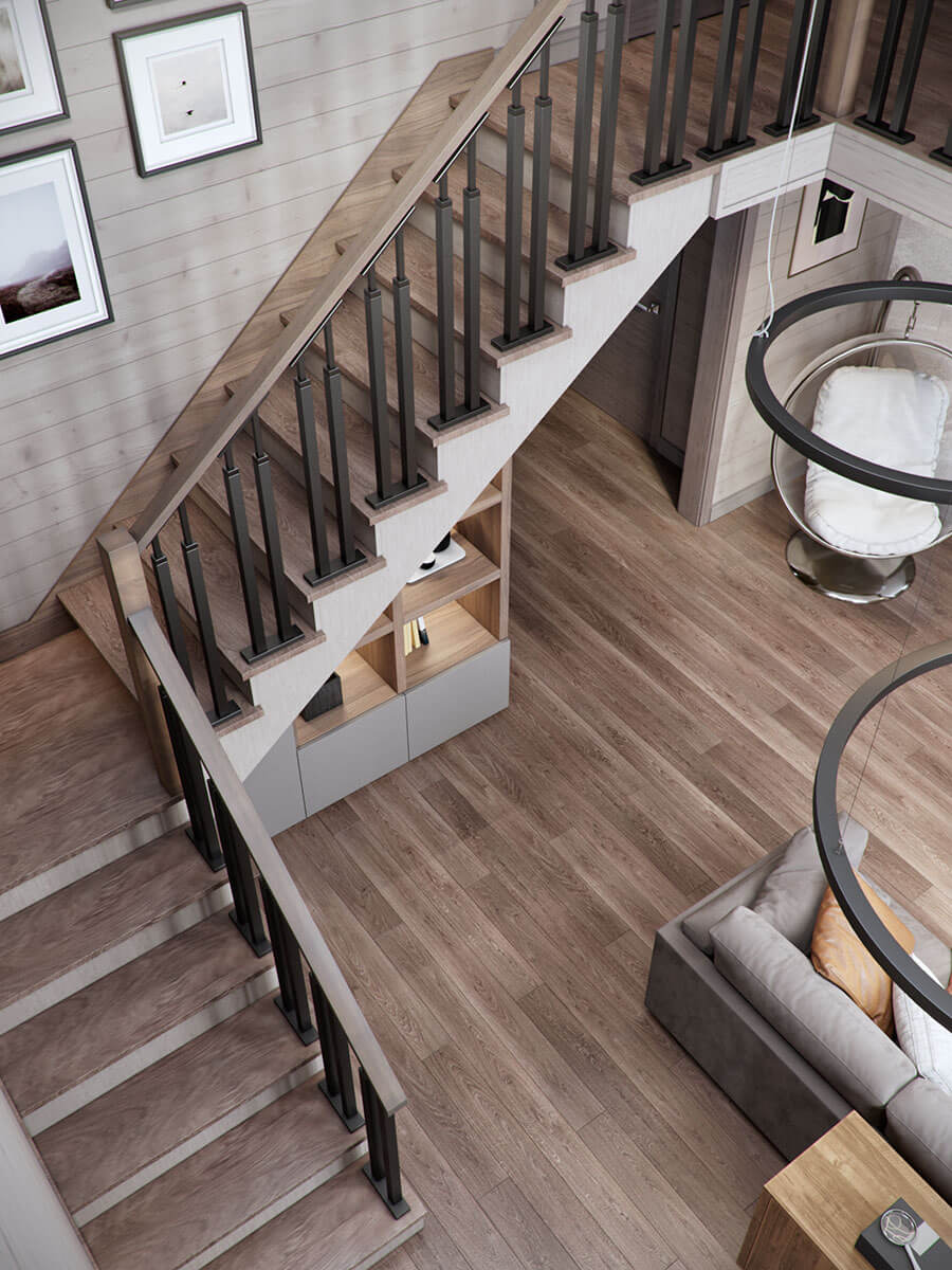 Под лестницей смонтированы встроенные шкафы, а также частично открытые полки с подсветкой.