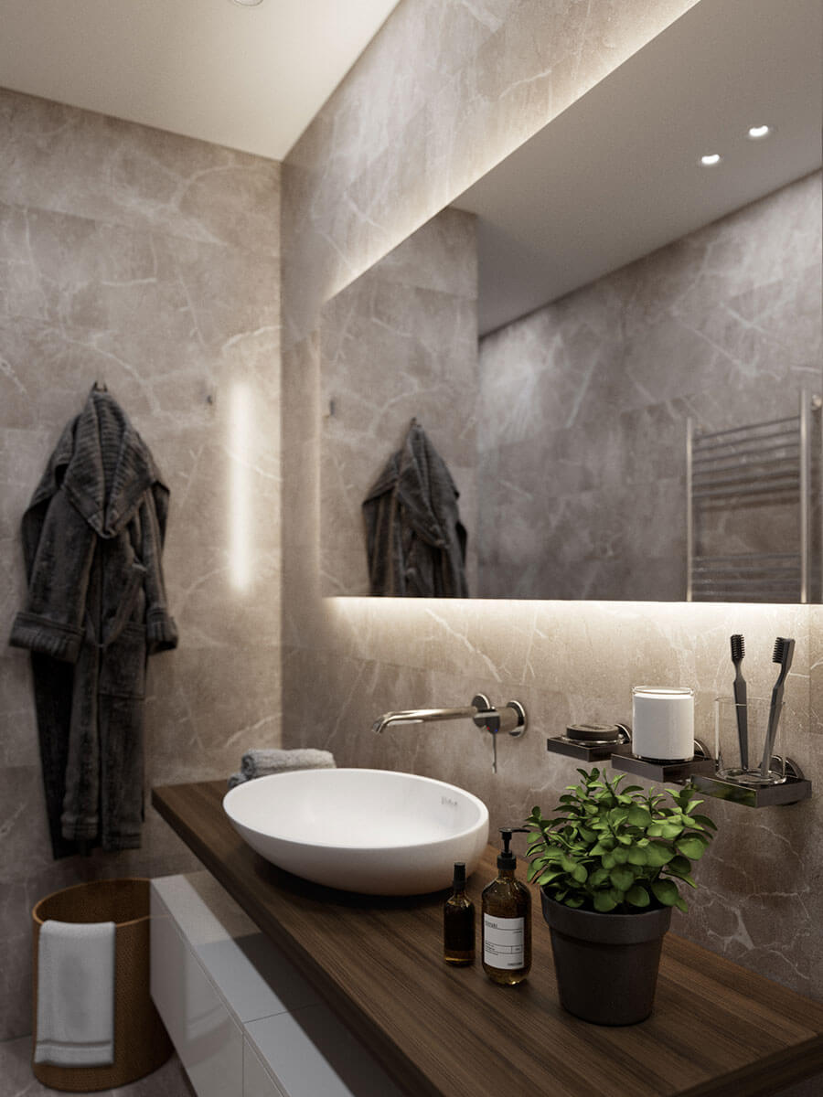 В центральной зоне использованы большие светодиодные светильники-кольца. Роль основного освещения в других помещениях играют встроенные точечные светильники.