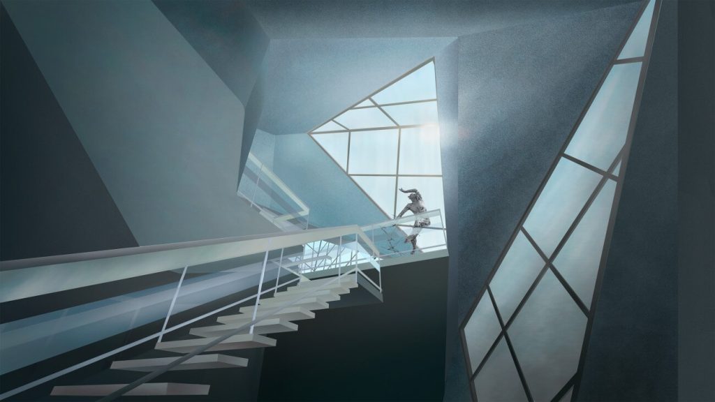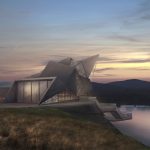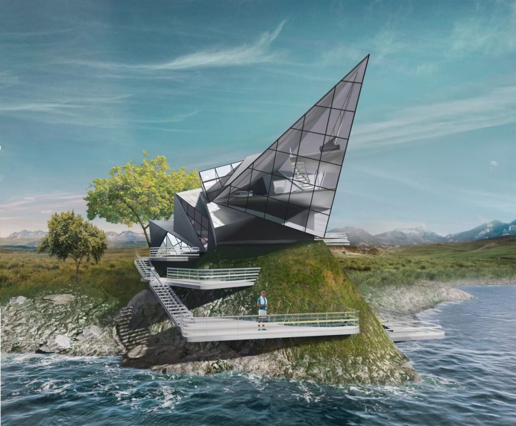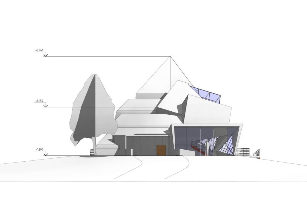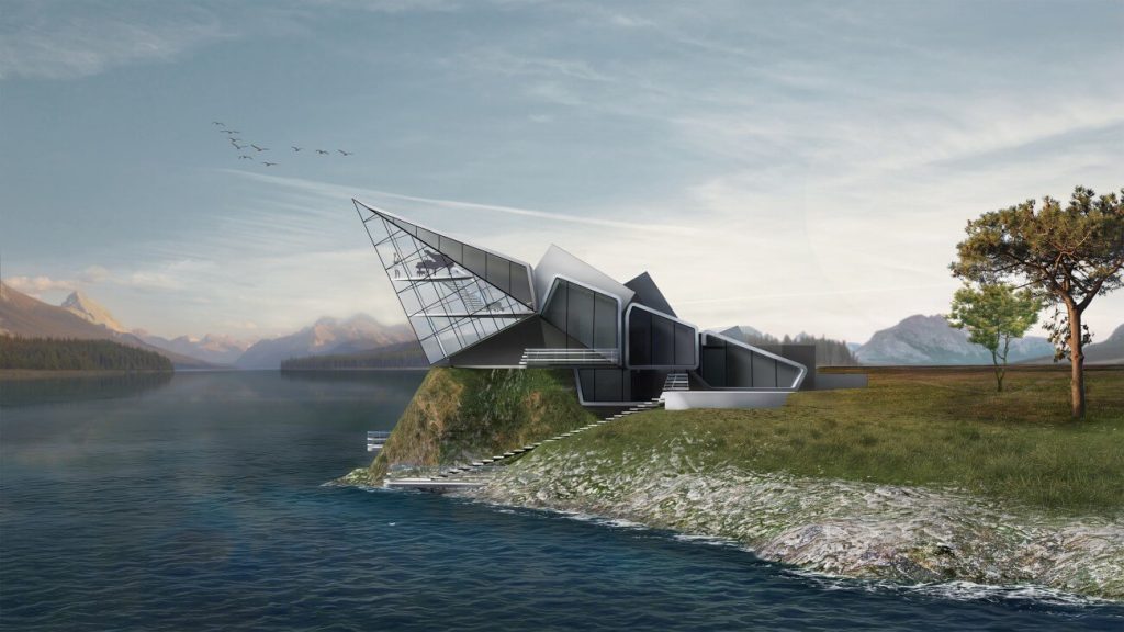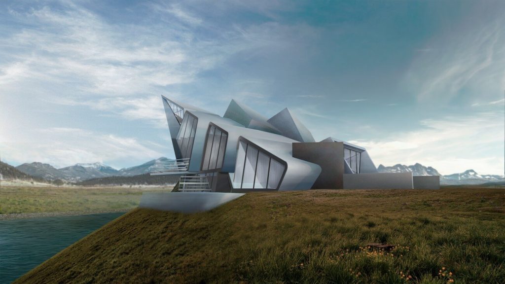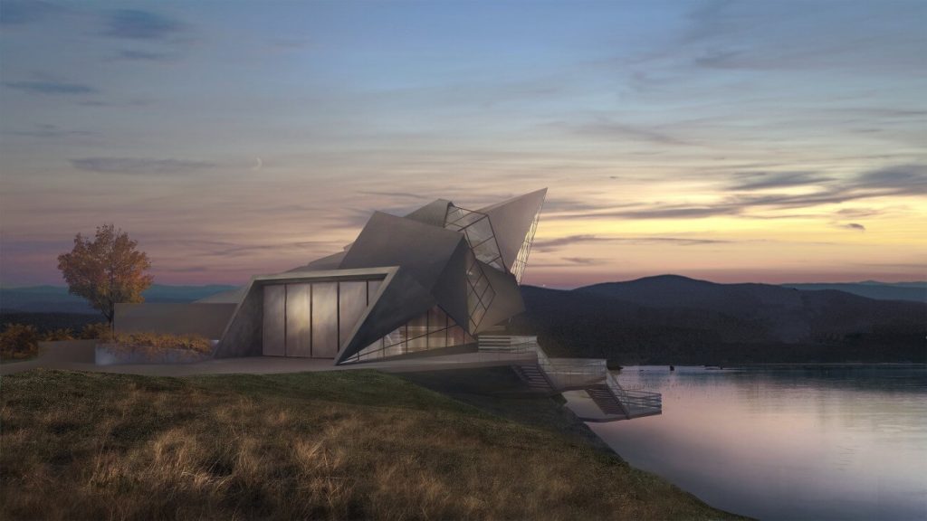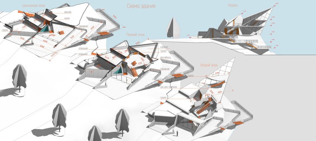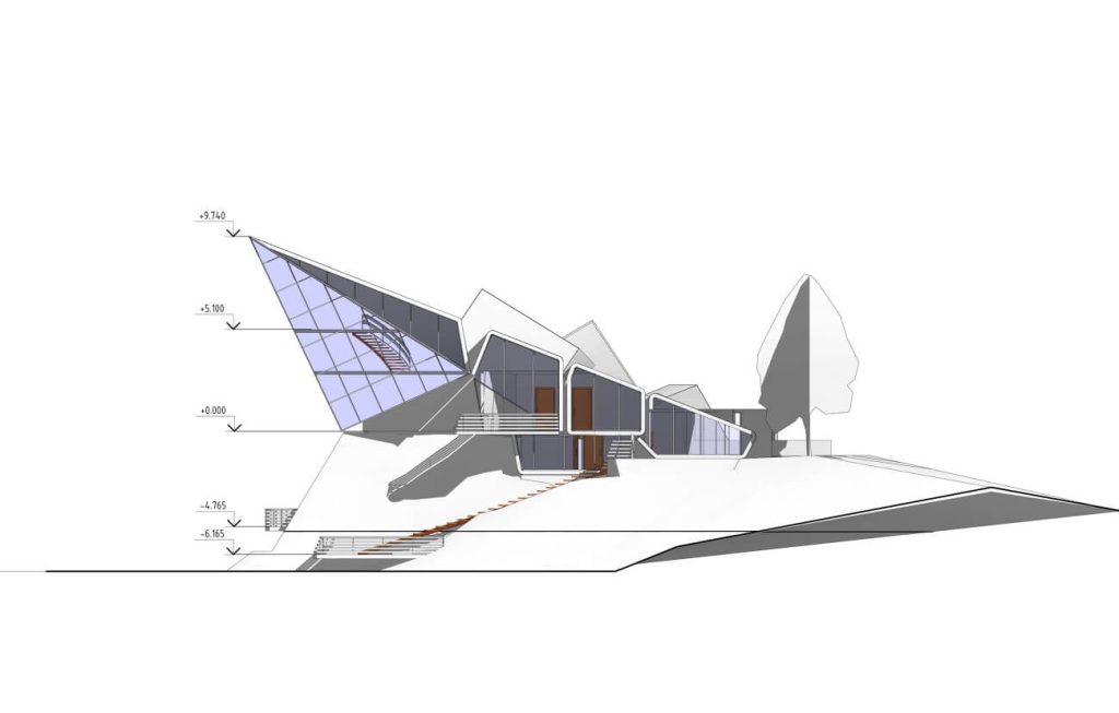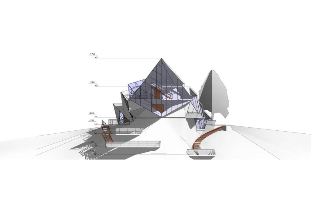 Дом для приемов и переговоров «Оригами» отсылает к образу скал, возвышающихся над холодными реками.