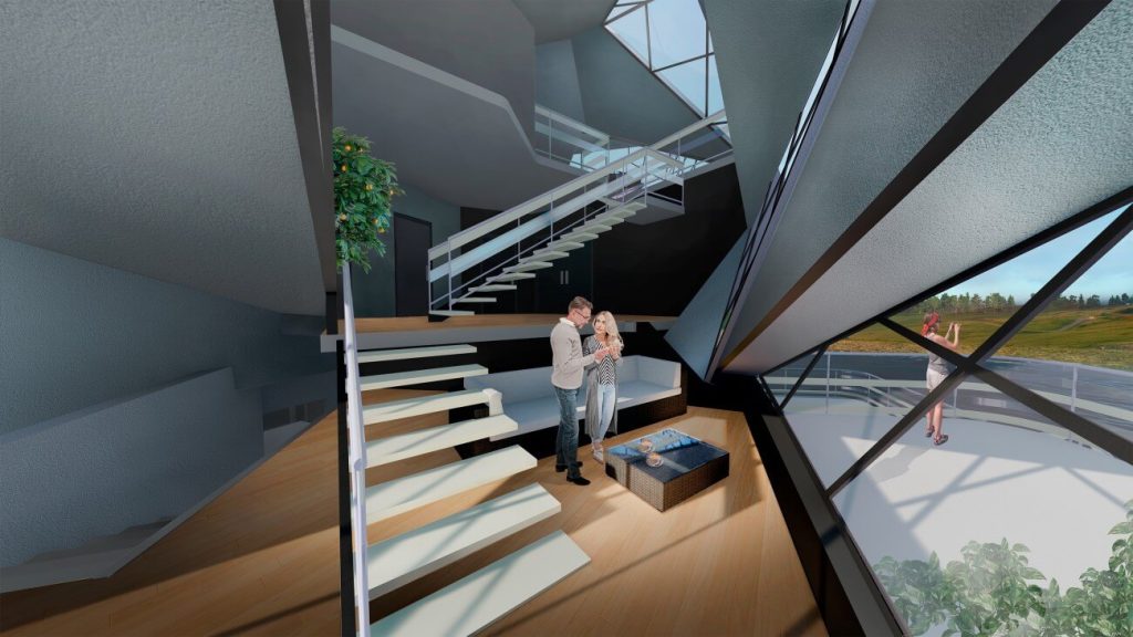 Дом создавался как место для огранизации небольших праздников, приемов, бизнес-переговоров. Здесь нет этажей в приямом понимании: это многоуровневое пространство. Большое количество уровней позволит гостям расбиваться на группы по интересам и не мешать друг другу в обсуждении бесед. Многоуровневость гостевых площадок начинается с самой верхней — небольшой сцены с роялем для музыкального сопровождения и важных речей — и переходит постепенно к нижним уровням, а затем к четырем терассам, подводящим прямо к воде.