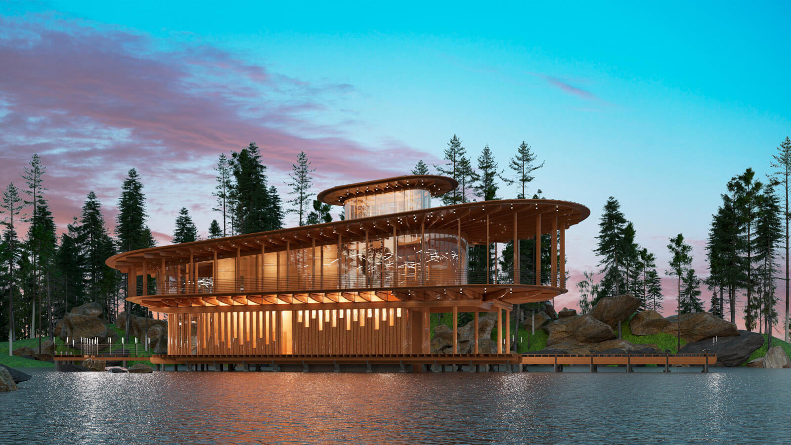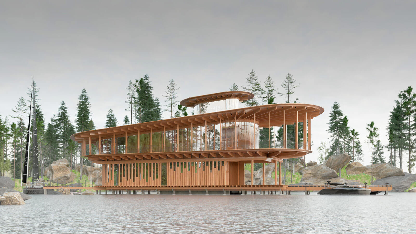 Идея проекта в архитектурном поиске самой архитектуры. В образе дома эллинга можно увидеть пароходы и пассажирские теплоходы старых проектов. Образ дома навеян речными походами по рекам. Световой фонарь отсылка к рулевой рубке — главному командному пункту судна. Второй этаж с прогулочной палубой по кругу, с стойками по периметру, передаёт образ средней палубы пассажирского судна. Первый этаж — с вертикальными брёвнами — это отсылка и к русской деревянной архитектуре, корабельным соснам для мачт и постройке парусных кораблей, и к северной лесной природе. Дом расположен в бухте на озере или водохранилище, во круг каменистые берега с хвойными деревьями.