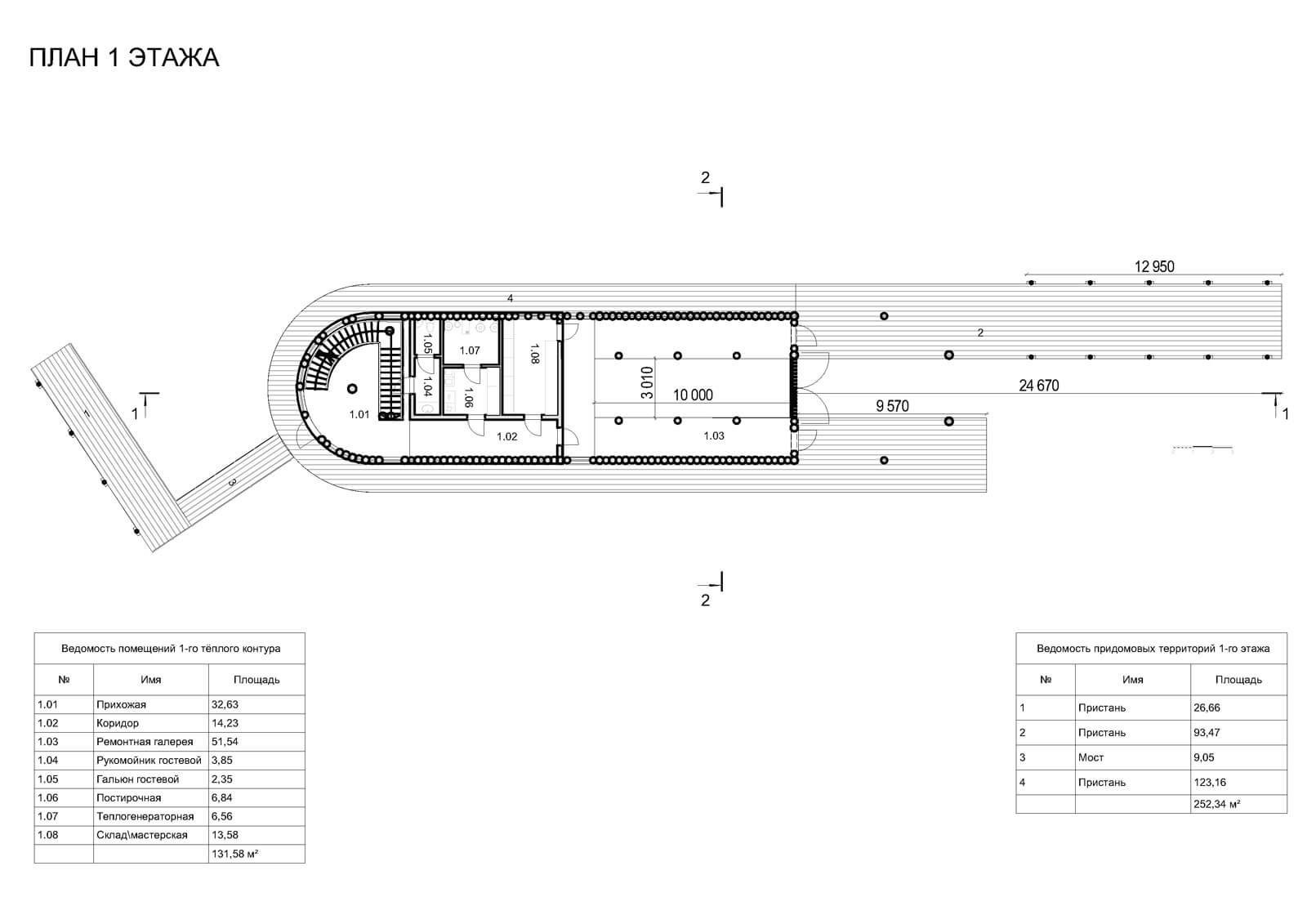 1 этаж технический и входная группа — прихожая, гостевой гальюн (СУ), теплогенераторная, постирочная, складмастерская, коридор, эллинг, пристани и мост.