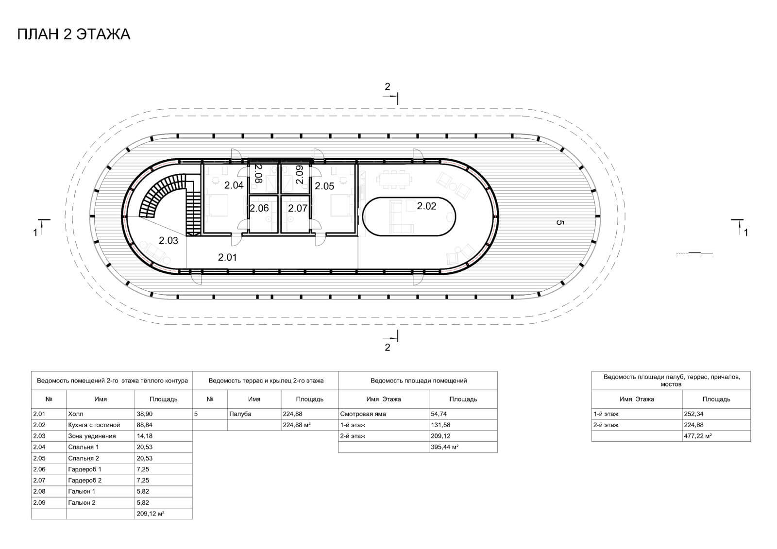 2 — этаж жилой — две каюты (комнаты) с гальюнами (СУ) и гардеробными, кухня - гостиная, палуба.