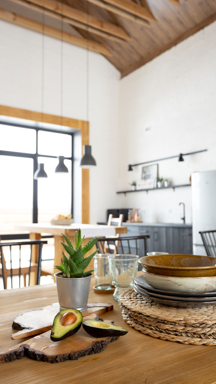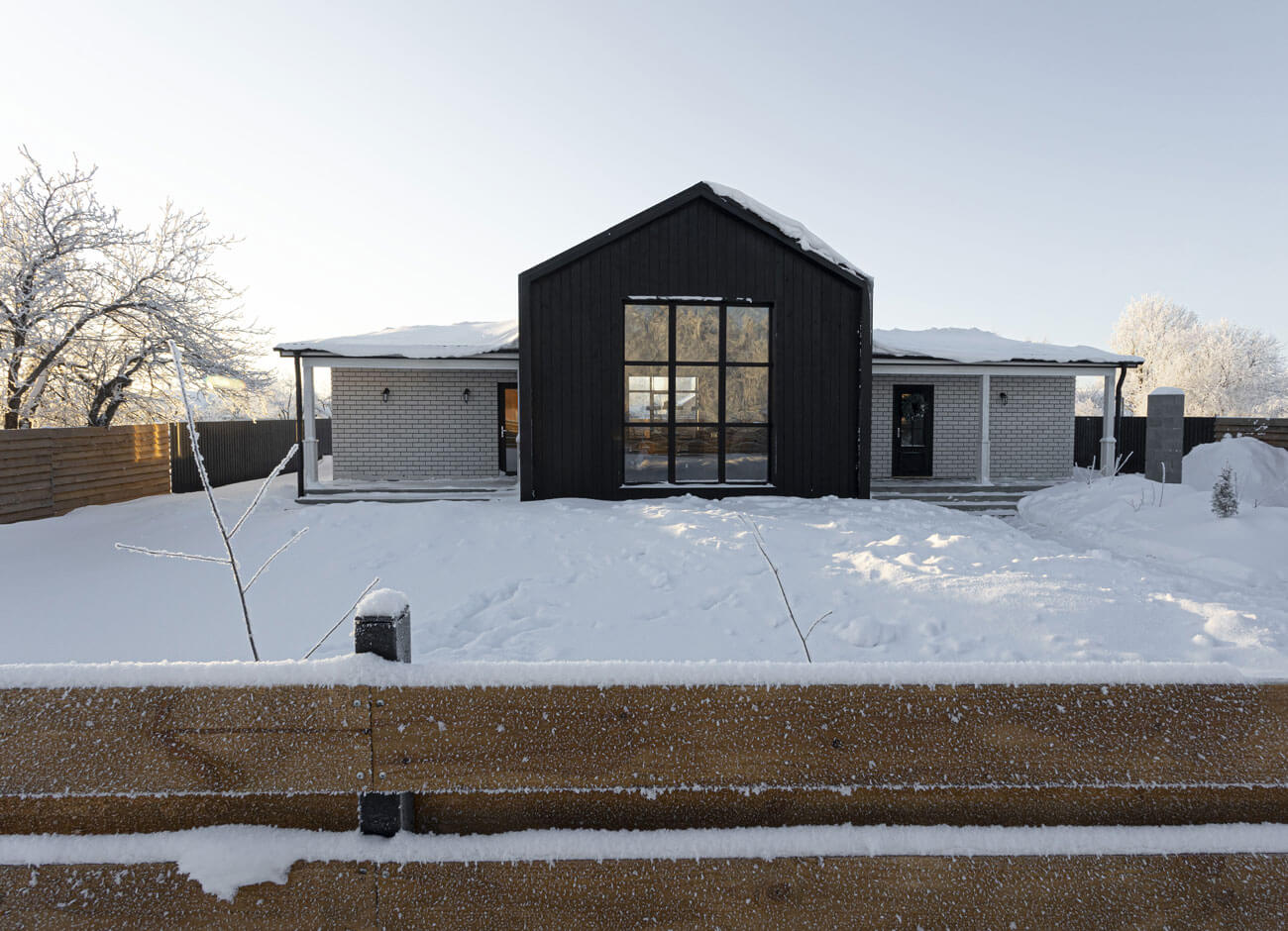 Дом состоит из трех блоков. Основная центральная часть – сердце дома кухня-гостиная с высокими потолками и большими окнами.
