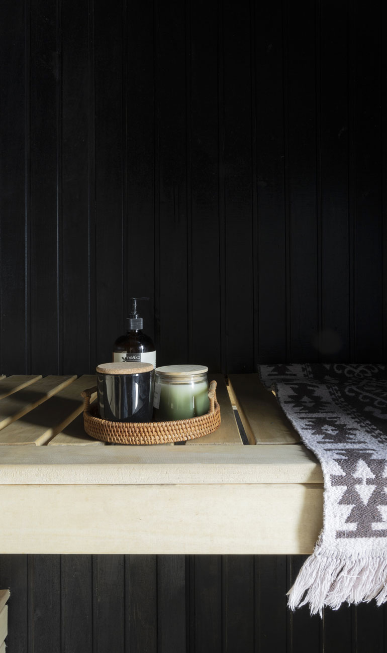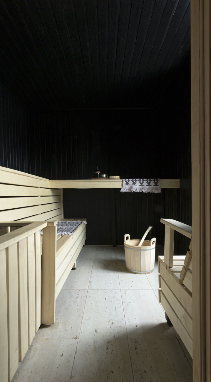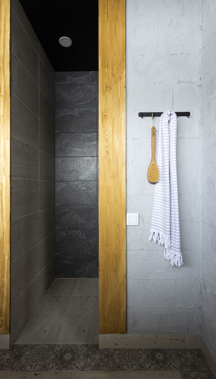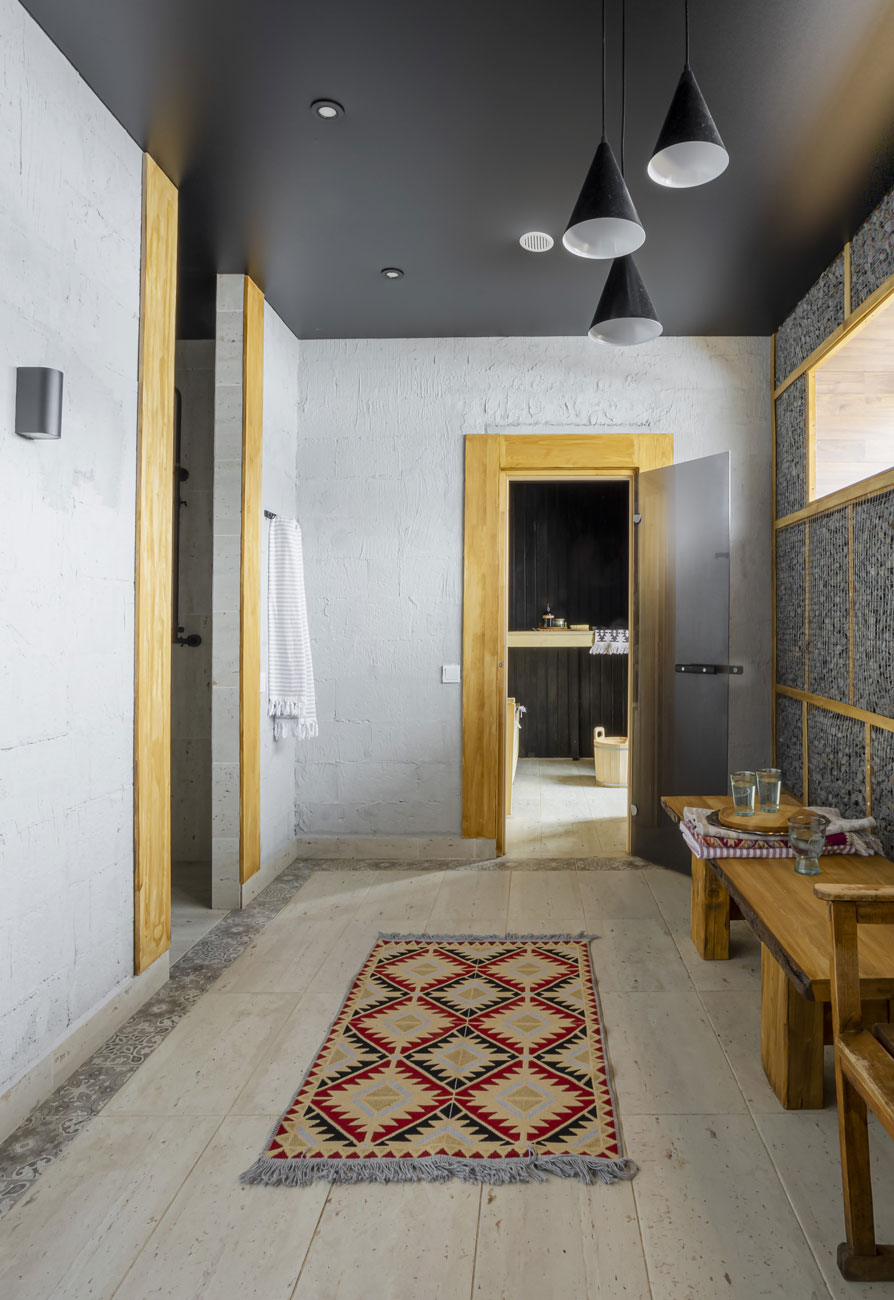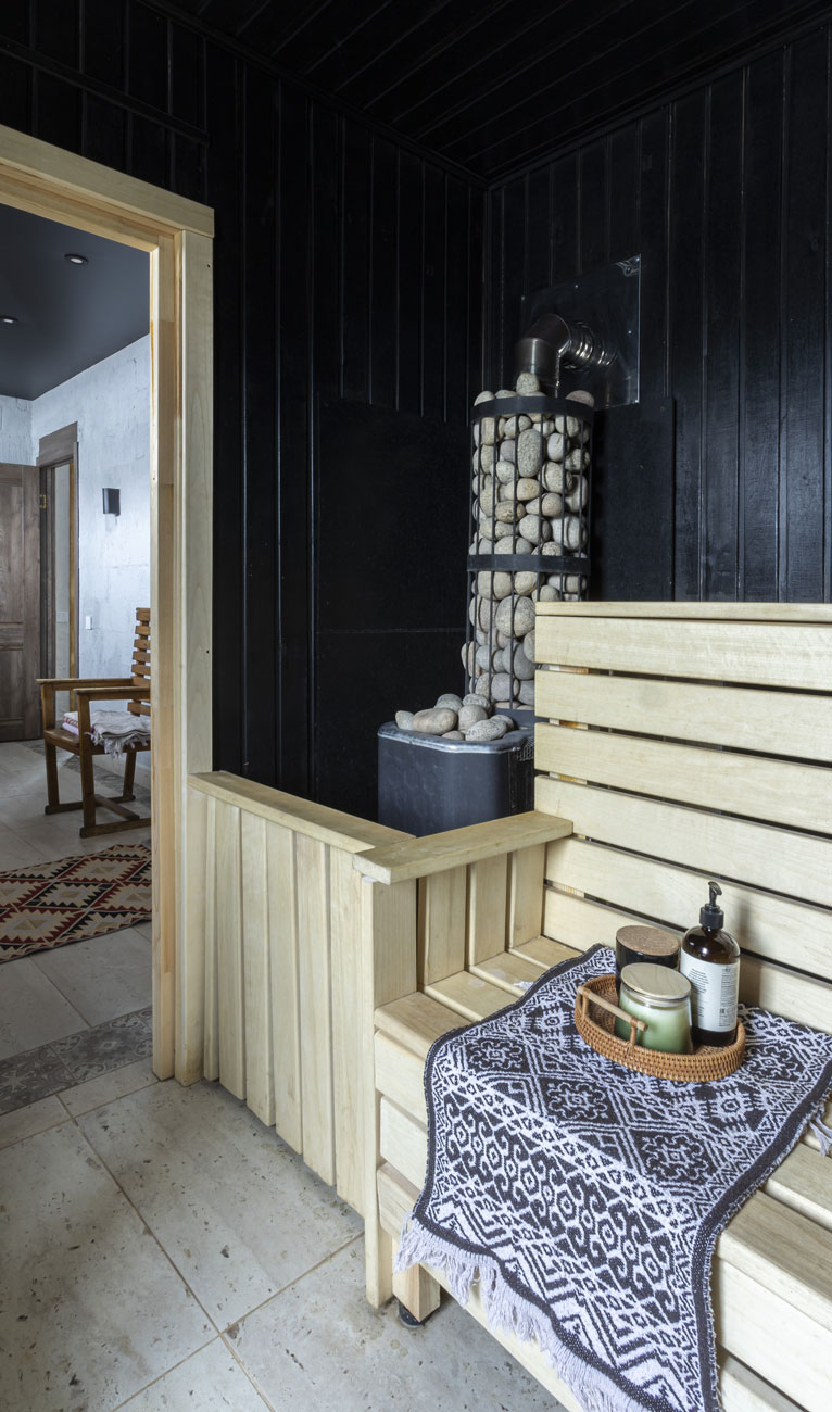 Основное цветовое решение монохромное, черно-серое с отсылом к природному камню. При этом, сама баня получилась уютной и теплой. Большую роль в этом сыграло натуральное дерево.
