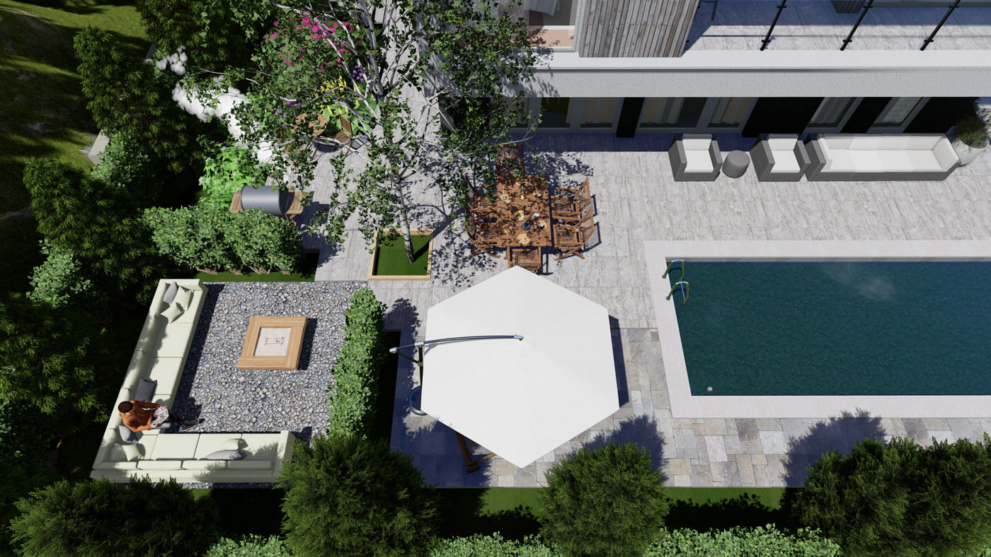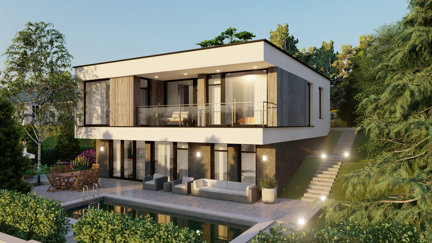 Архитектурная концепция: Участок обладает активным рельефом с перепадом высот более трёх метров и уклоном в сторону Шершневского водохранилища. Эта особенность легла в основу объемно-пространственного решения: со стороны дороги дом воспринимается как одноэтажный, что сохраняет масштаб и интеграцию в природный ландшафт.