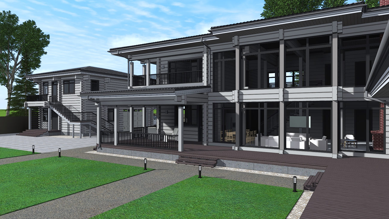 Основной дом поделен на две зоны — жилая зона и зона СПА, включающая помещения сауны, хамама и бассейна. В жилой зоне расположена просторная кухня-гостиная со вторым светом, позволяющая хозяевам принимать много гостей одновременно. Спальня родителей с собственными санузлом и гардеробом также расположена на первом этаже, второй этаж полностью принадлежит детям. На втором этаже расположены 4 комнаты, одна из которых является гостевой.